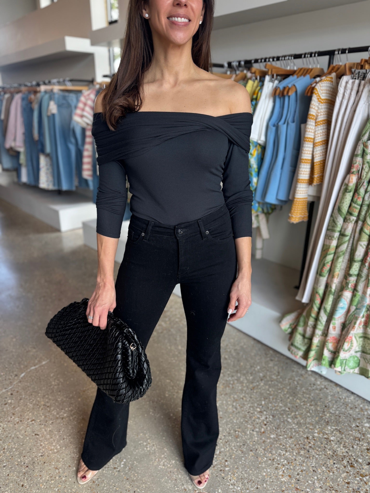 Sleek, sculpting, and effortlessly elevated. The Lyra Top features an off-the-shoulder neckline with soft crossover detailing that feels modern yet timeless. It’s the kind of piece that instantly dresses up denim while still feeling comfortable and wearable.