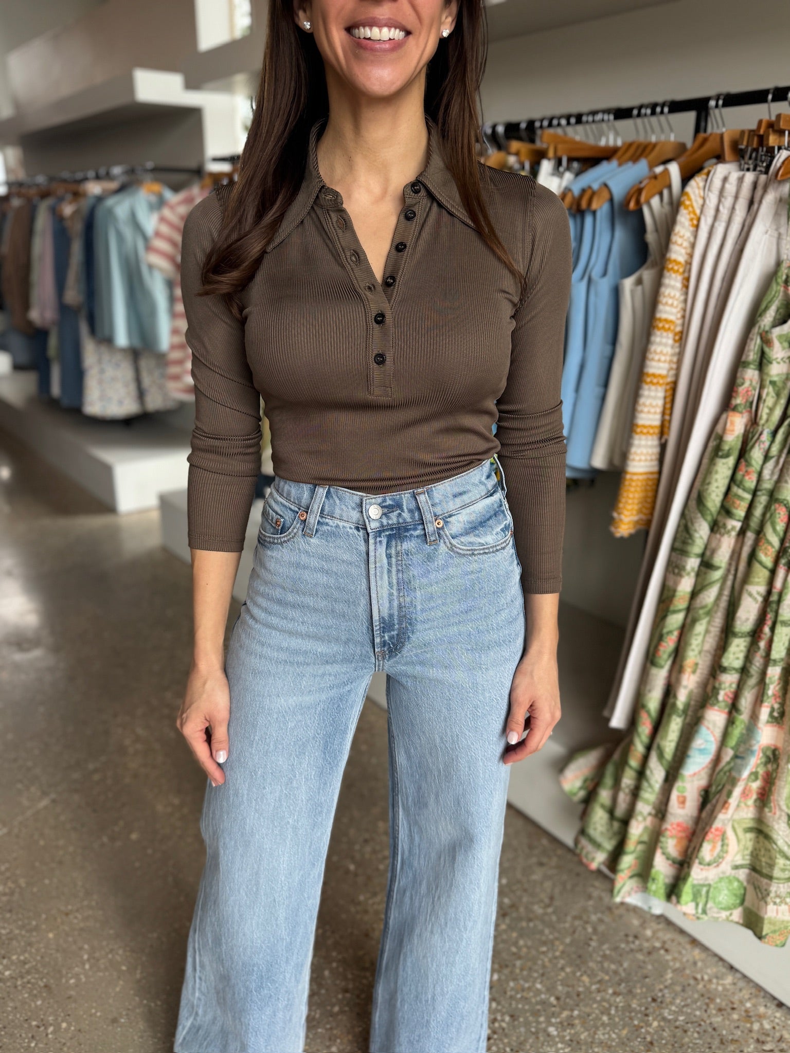 Looks Like: long sleeve henley with pointed collar
