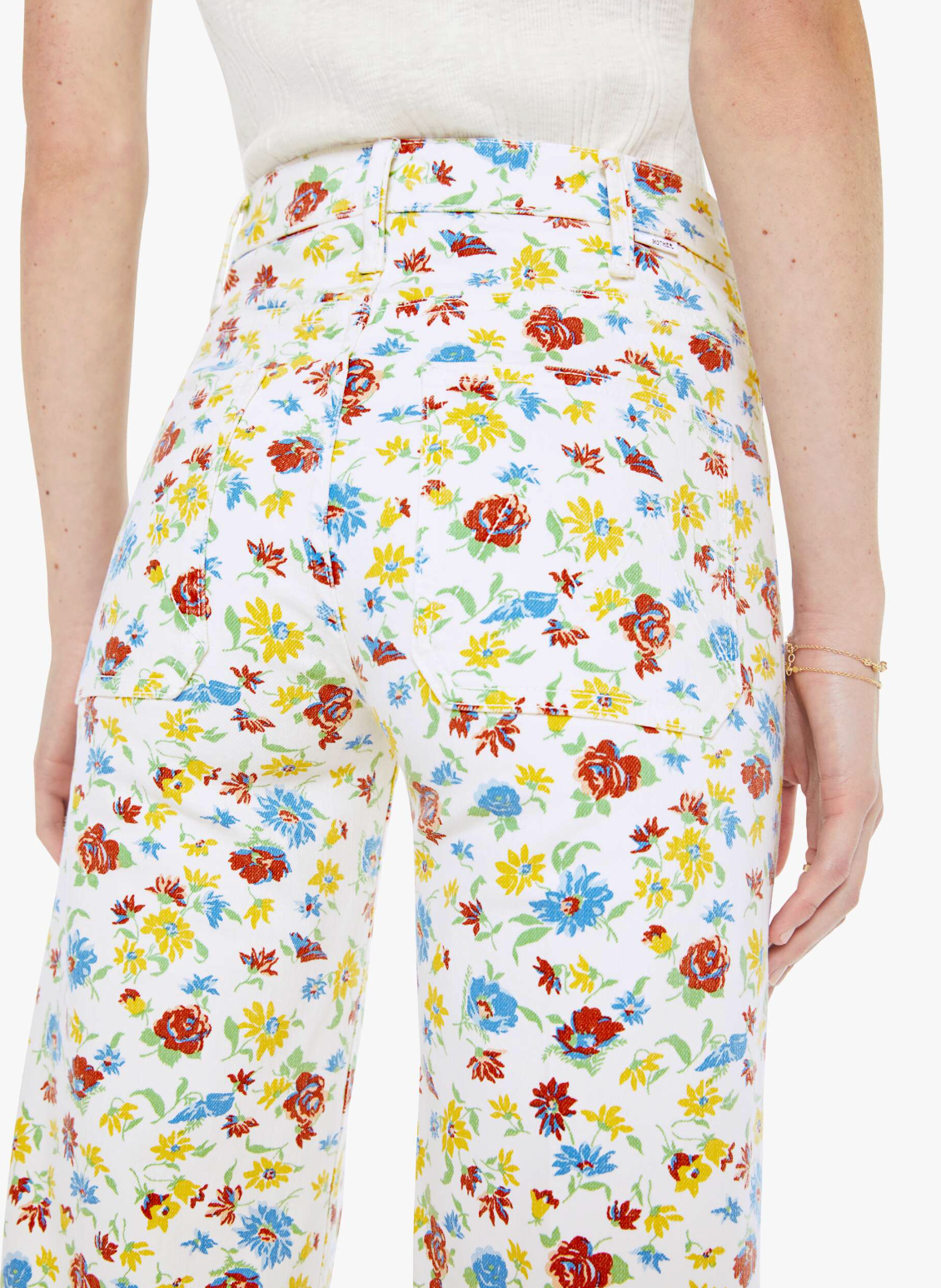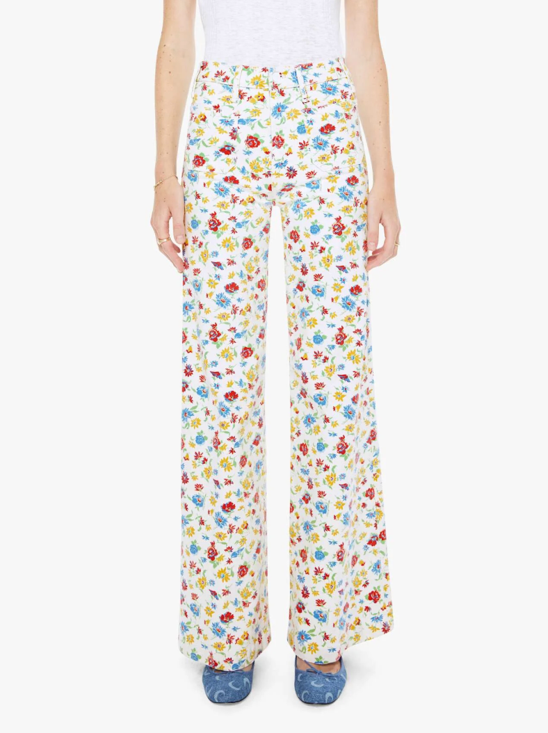 70s-inspired wide leg jeans with a high rise, zip fly, patch pockets, 32-inch inseam and clean hem. Made from stretch denim, Rose Bowl is a bright white with a colorful floral print.