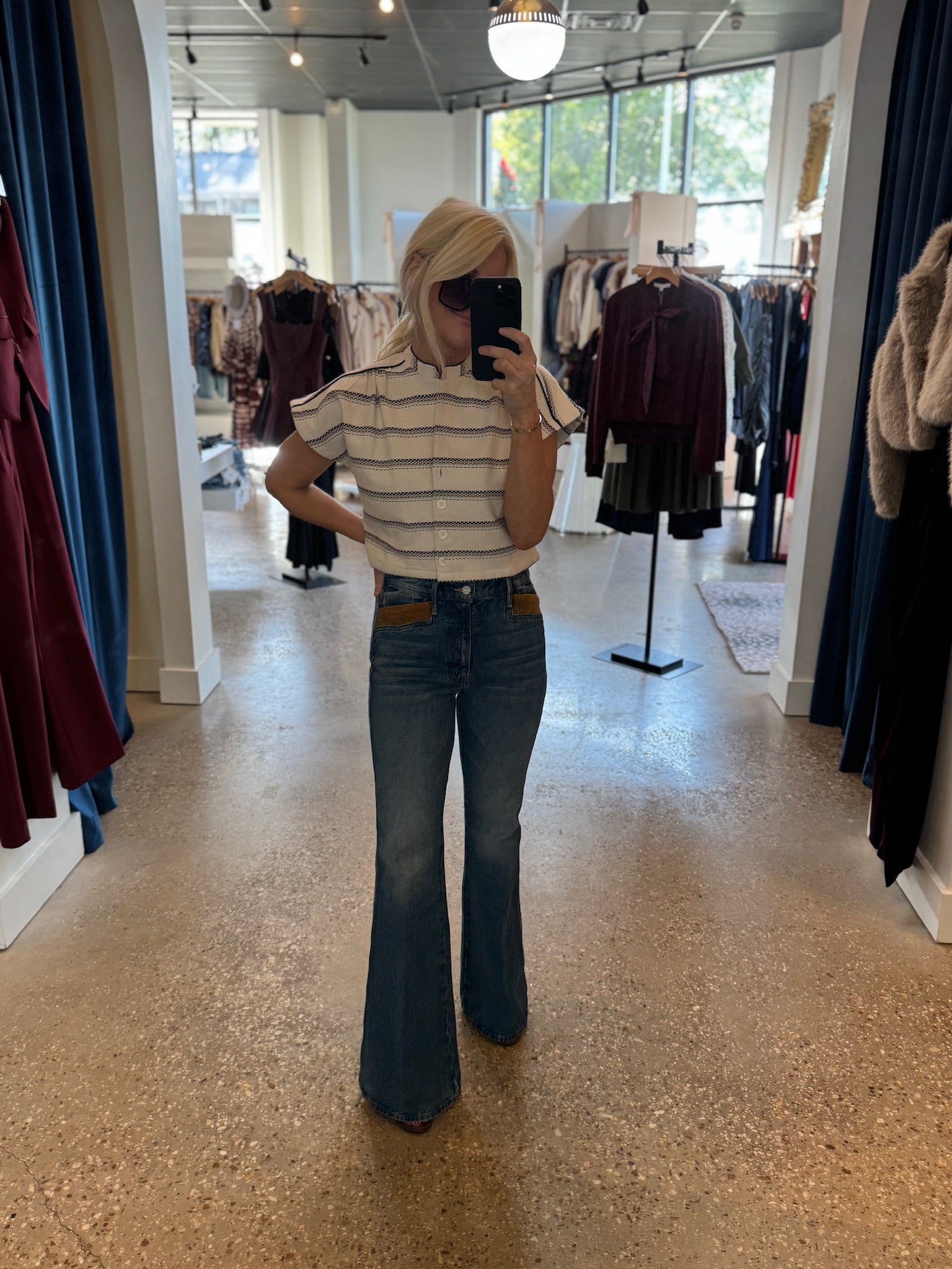 A blast from the past. A high-rise flare with a zip fly, off-center back pockets, a long 34-inch inseam and a clean hem. Made from rigid SUPERIOR denim, Remember When is a mid-blue with whiskering and fading at the knees and corduroy trim on the pockets.
