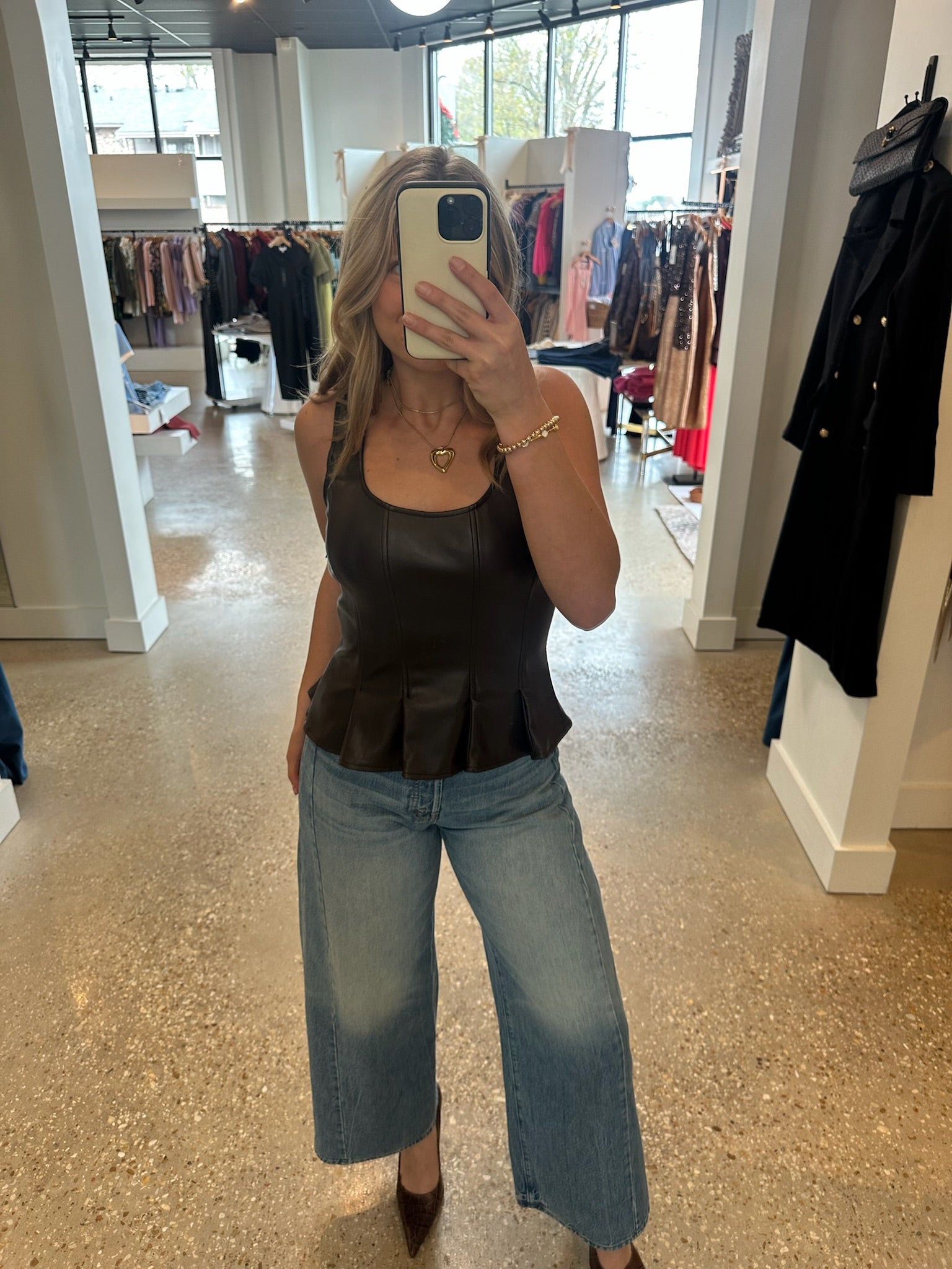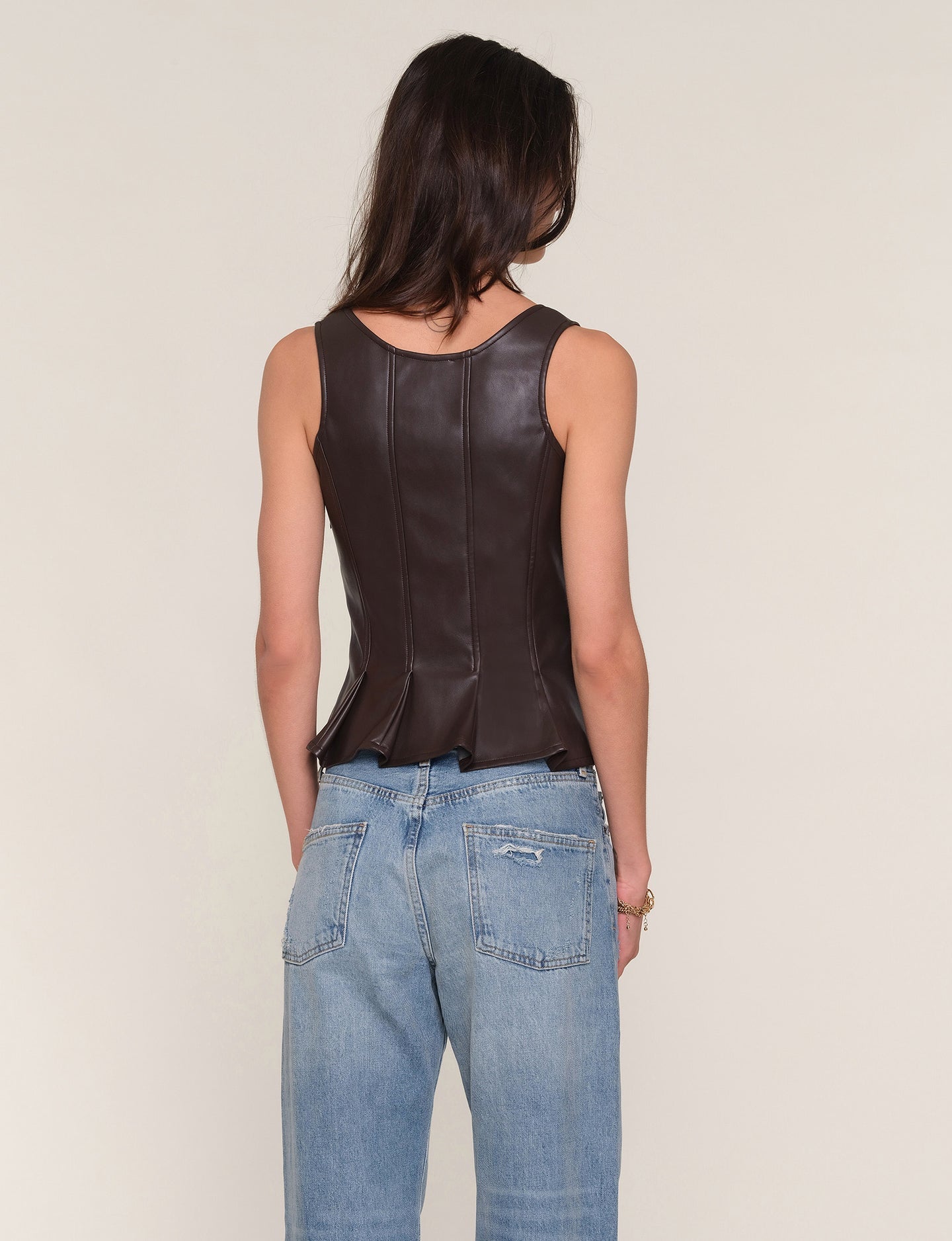 The Larosey Top is made from a faux leather. It features seamed details that release at the waist creating a flared hem.