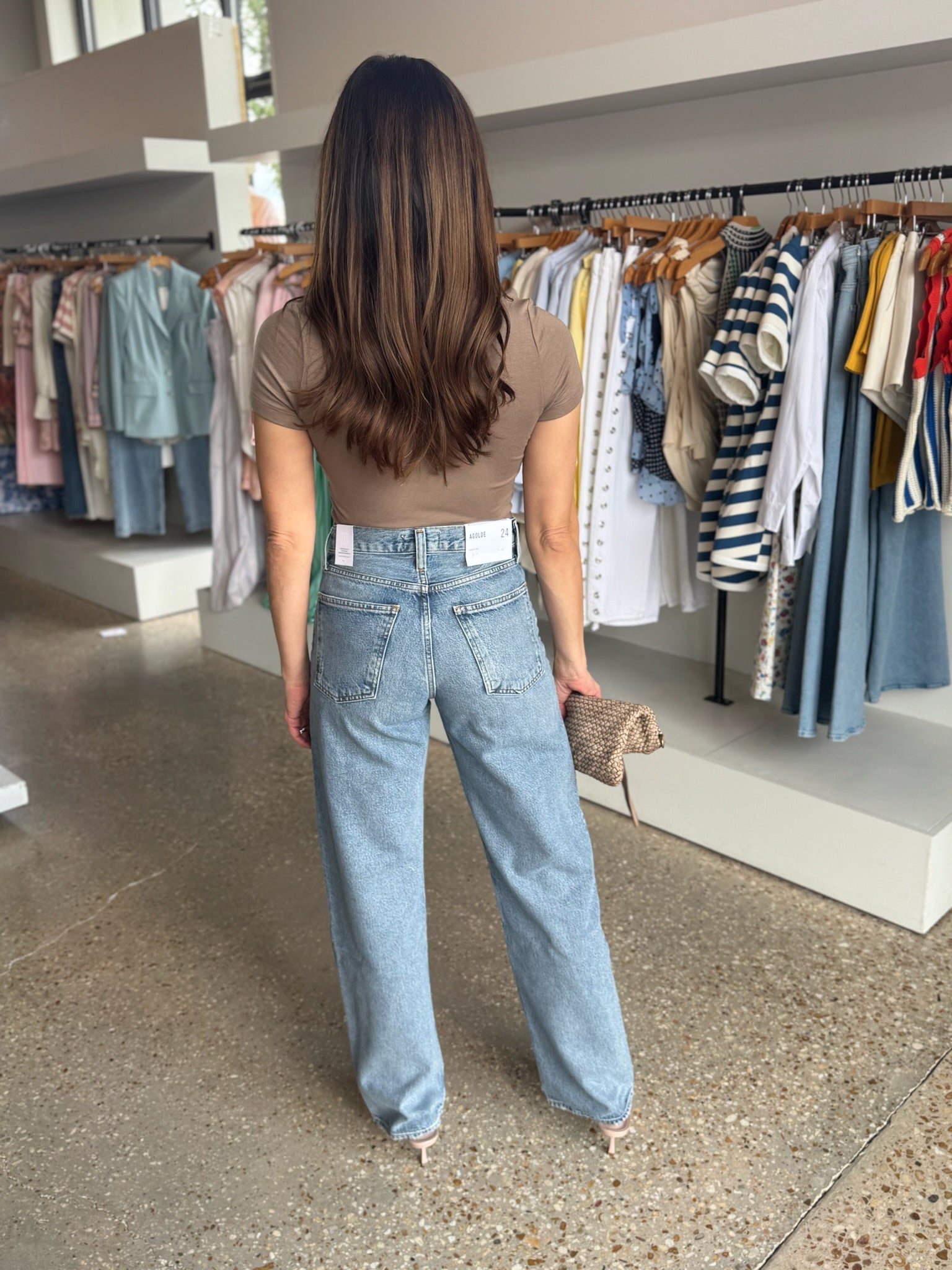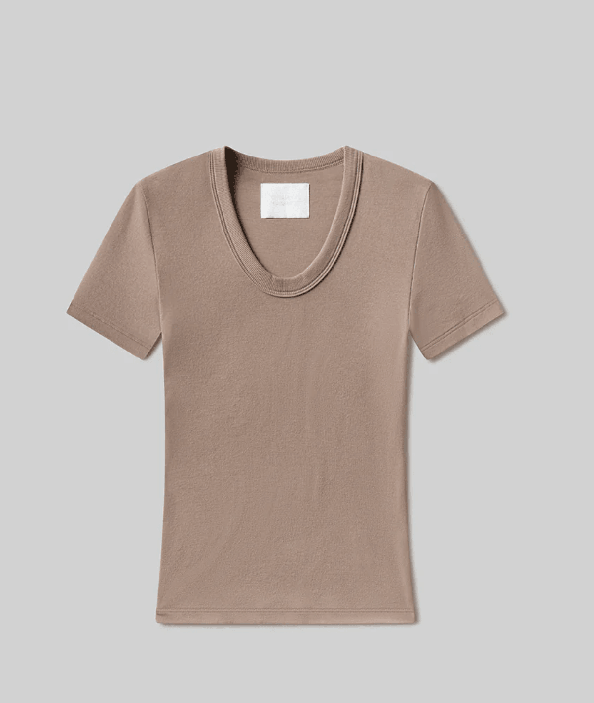 Looks Like: Medium brown short sleeve u-neck tee with grey undertones