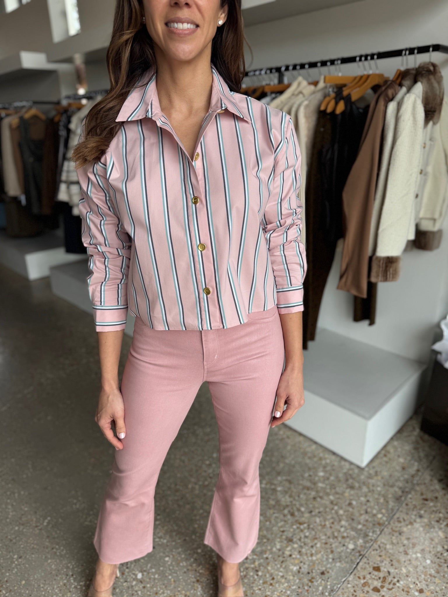 A classic tailored shirt with a cool, borrowed-from-the-boys fit and cropped high-low hem. Now back in a striped pale pink.