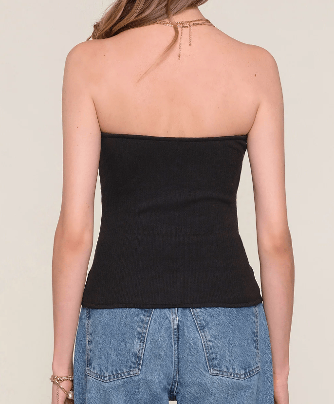 The Marinette Top is a strapless, faux suede top with a slim fit. It features pleats at side seam and a knit back for a super flattering look.