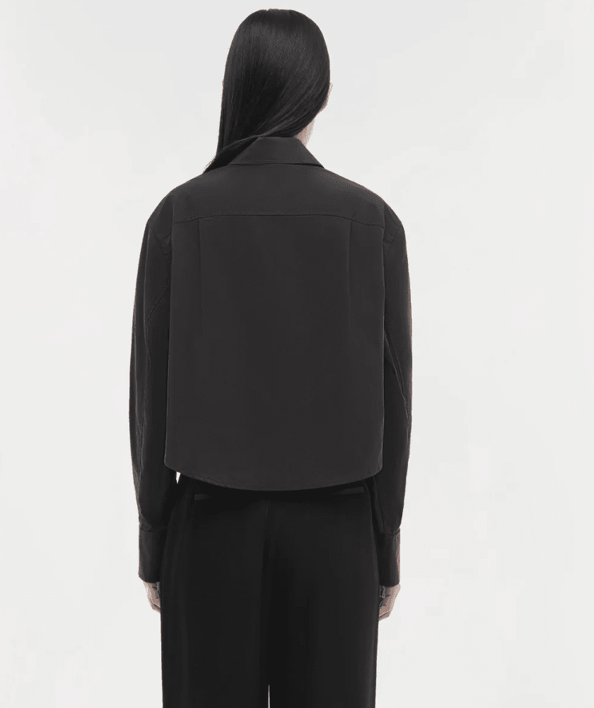 The Renata Shirt in Black. Elevate your wardrobe with this crisp cropped button-down. Designed with a sharp collar and a clean front, its tailored fit provides a sophisticated silhouette. Perfectly versatile, it's a modern staple for both casual and dressier ensembles.