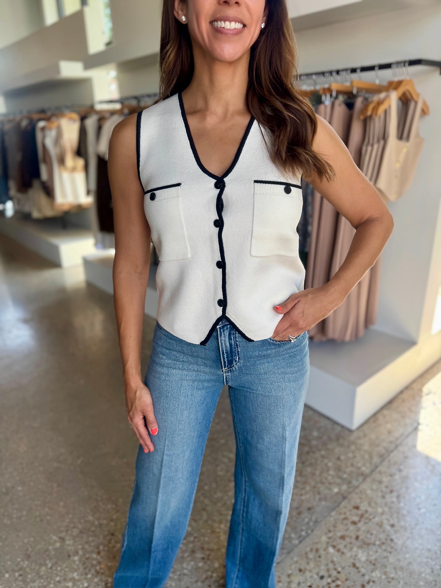 Chic, structured, and distinctly Parisian—the Gino Top by Suncoo blends vintage-inspired elegance with a modern edge. Crafted in a creamy blanc cassé knit and finished with contrasting black trim, this sleeveless cardigan-style top is the perfect balance of polished and playful.
