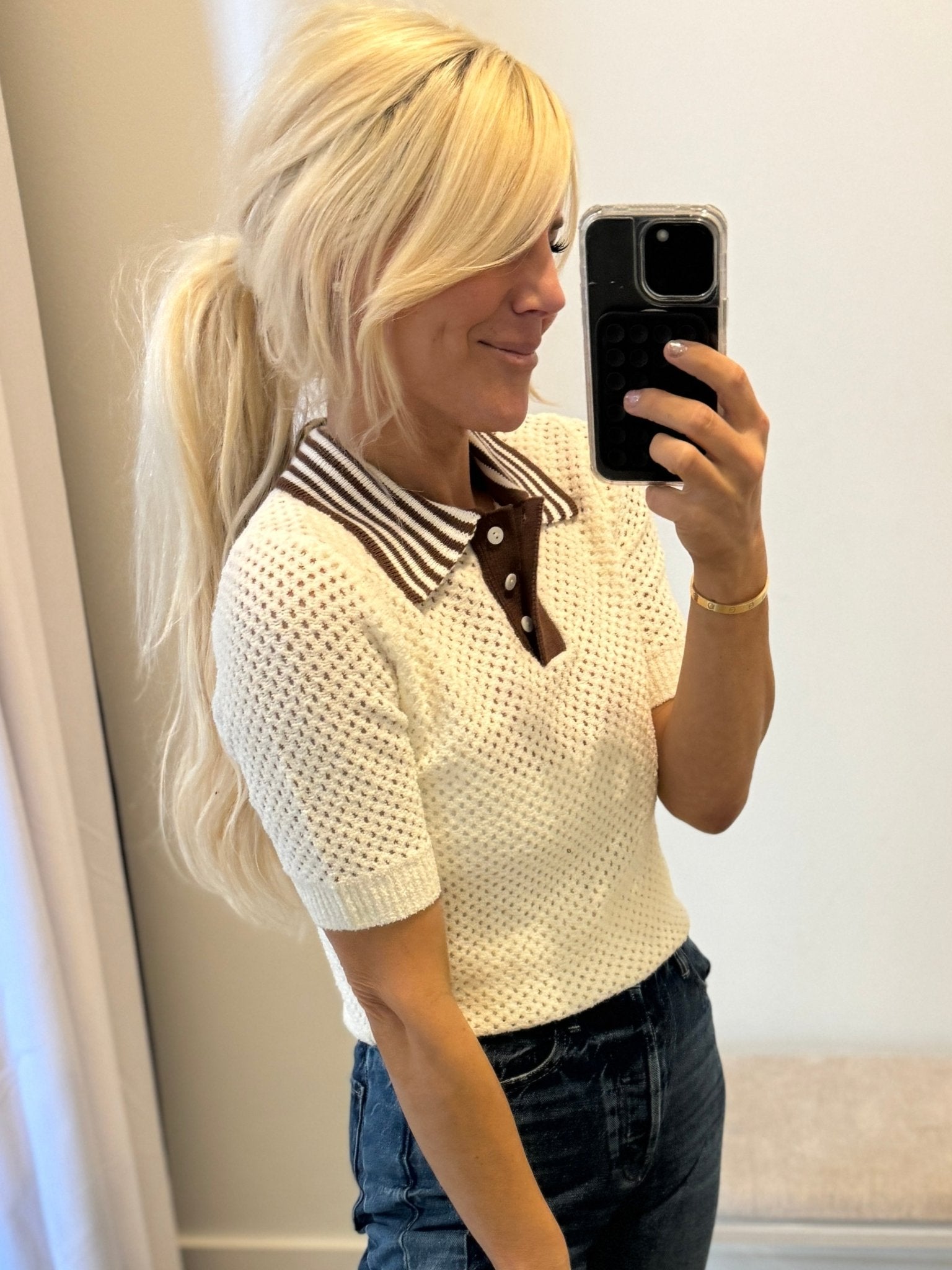 Sporty sophistication meets vintage charm in the Suncoo Perigue Top. Rendered in a soft blanc cassé hue, this knit features an airy open-weave texture that adds lightness and subtle dimension. The contrasting brown collar and button placket, finished with striped detailing, lend a polished, retro-inspired touch.