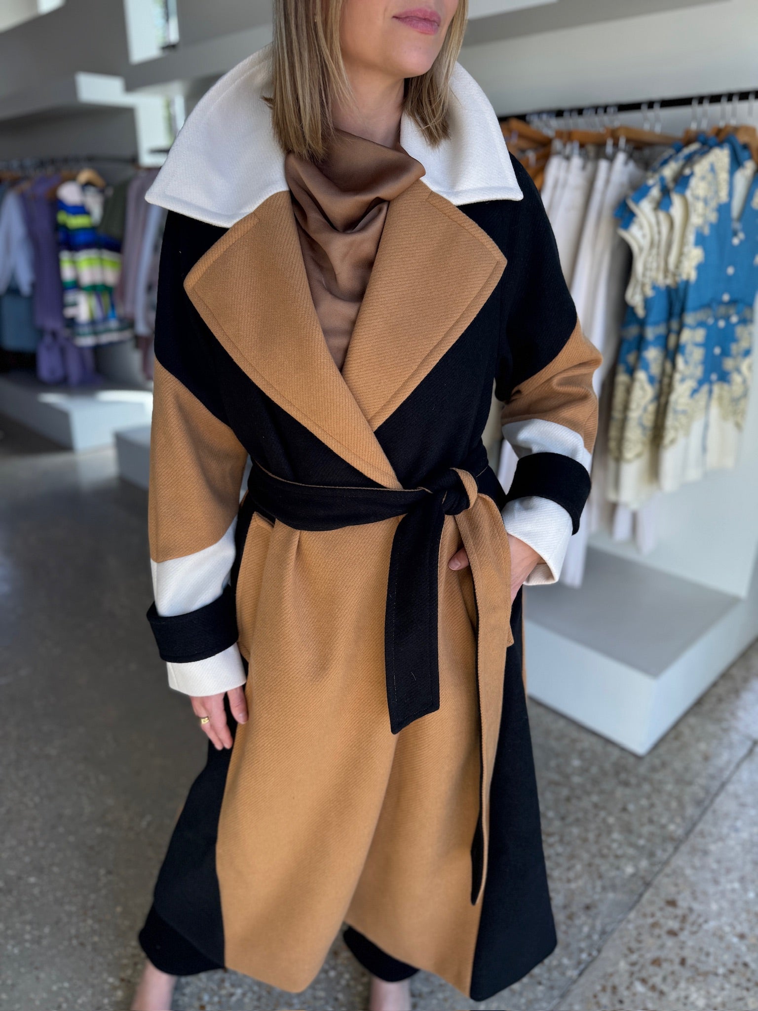 This coat is pure main-character energy. The bold colorblocking feels architectural and modern, while the belted silhouette keeps it timeless and flattering. It’s the kind of outerwear that doesn’t just finish an outfit, it defines it.