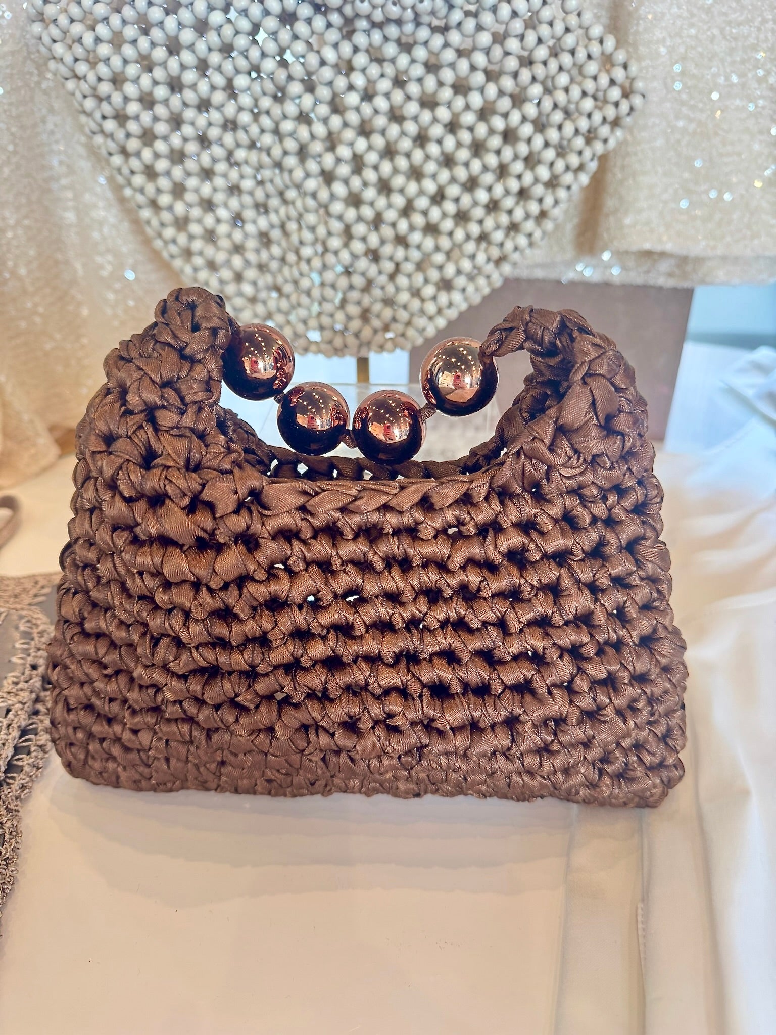 A stunning bucket bag, beautifully adorned with large pearl beads that add a touch of luxurious charm. This eye-catching piece effortlessly blends style and functionality, making it the perfect accessory for both day and evening wear.