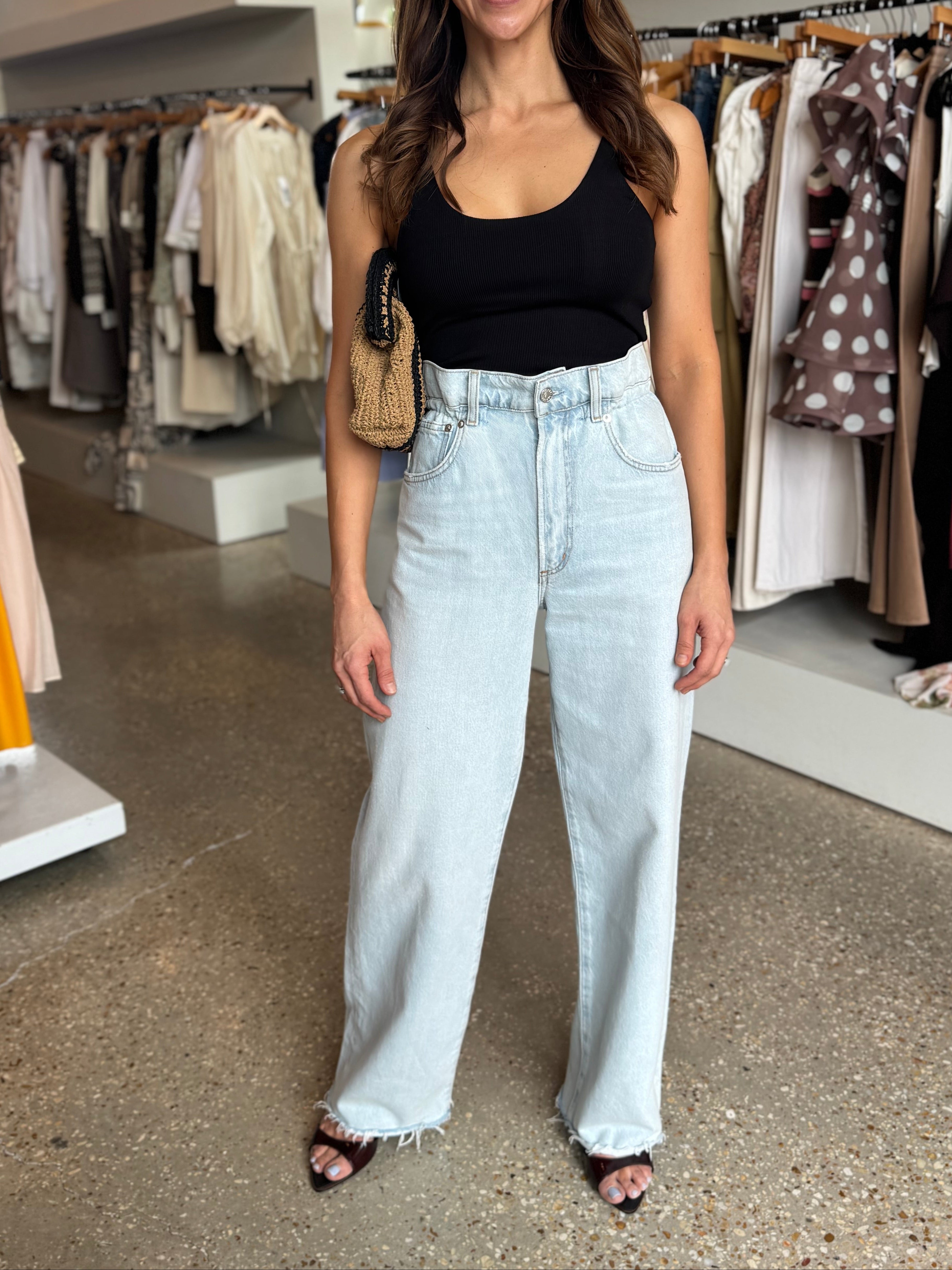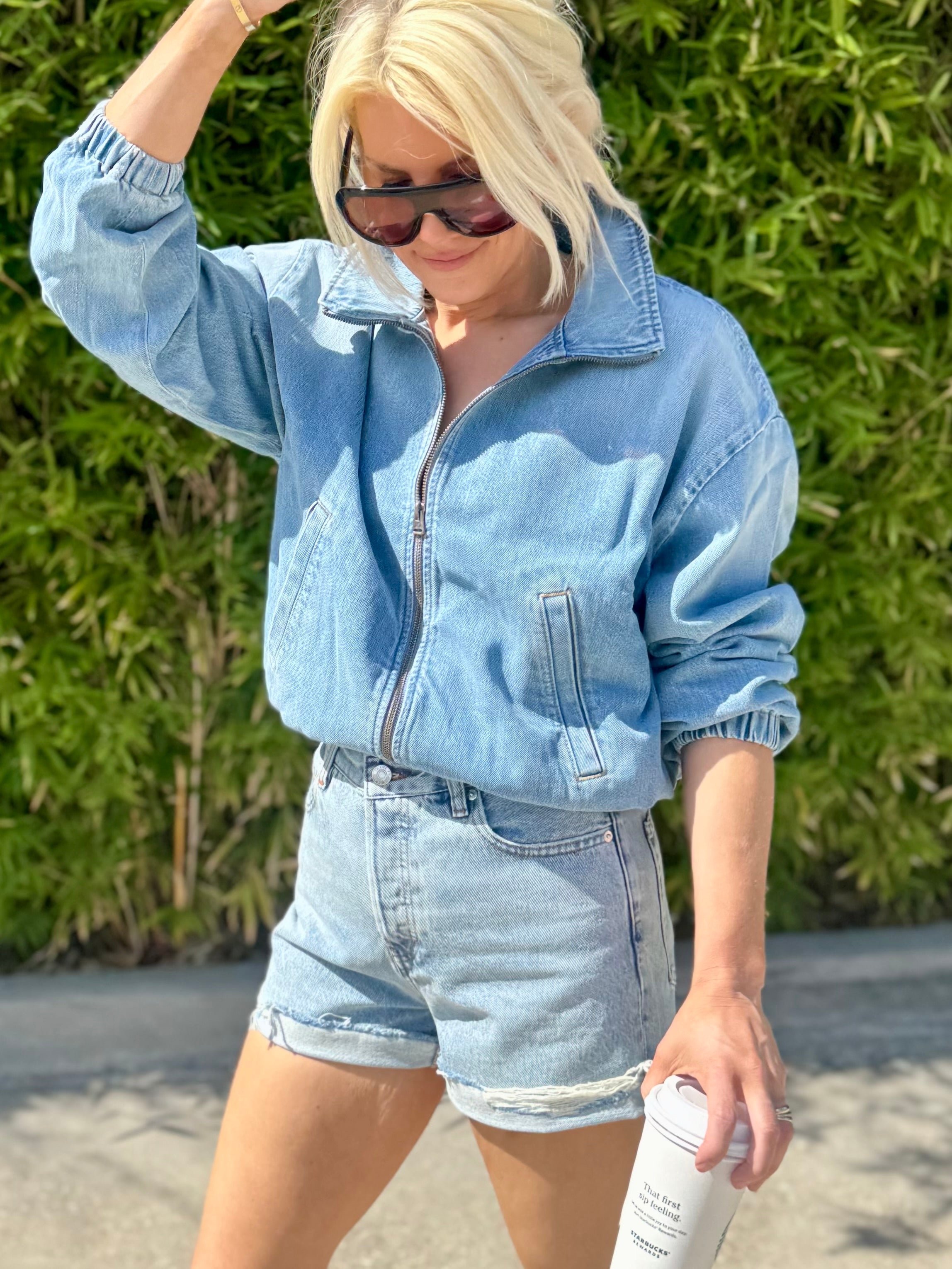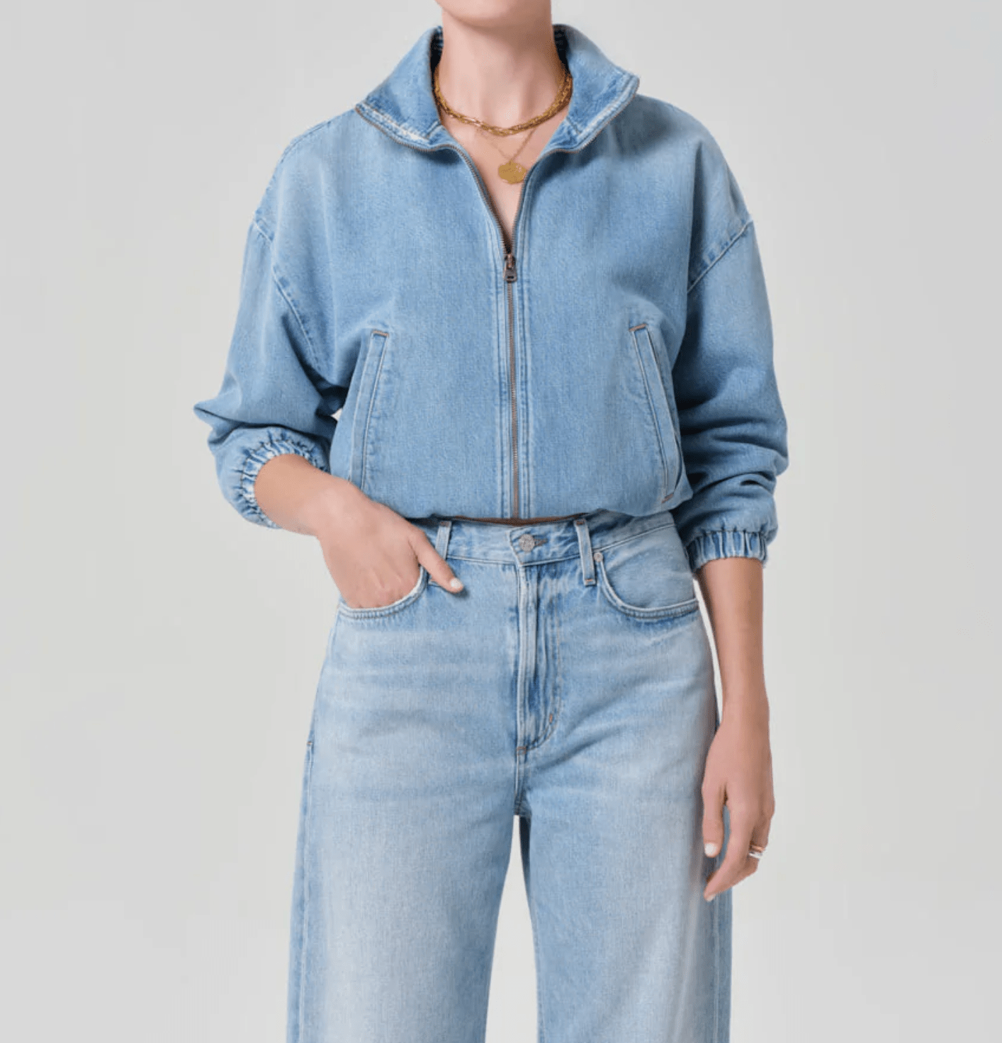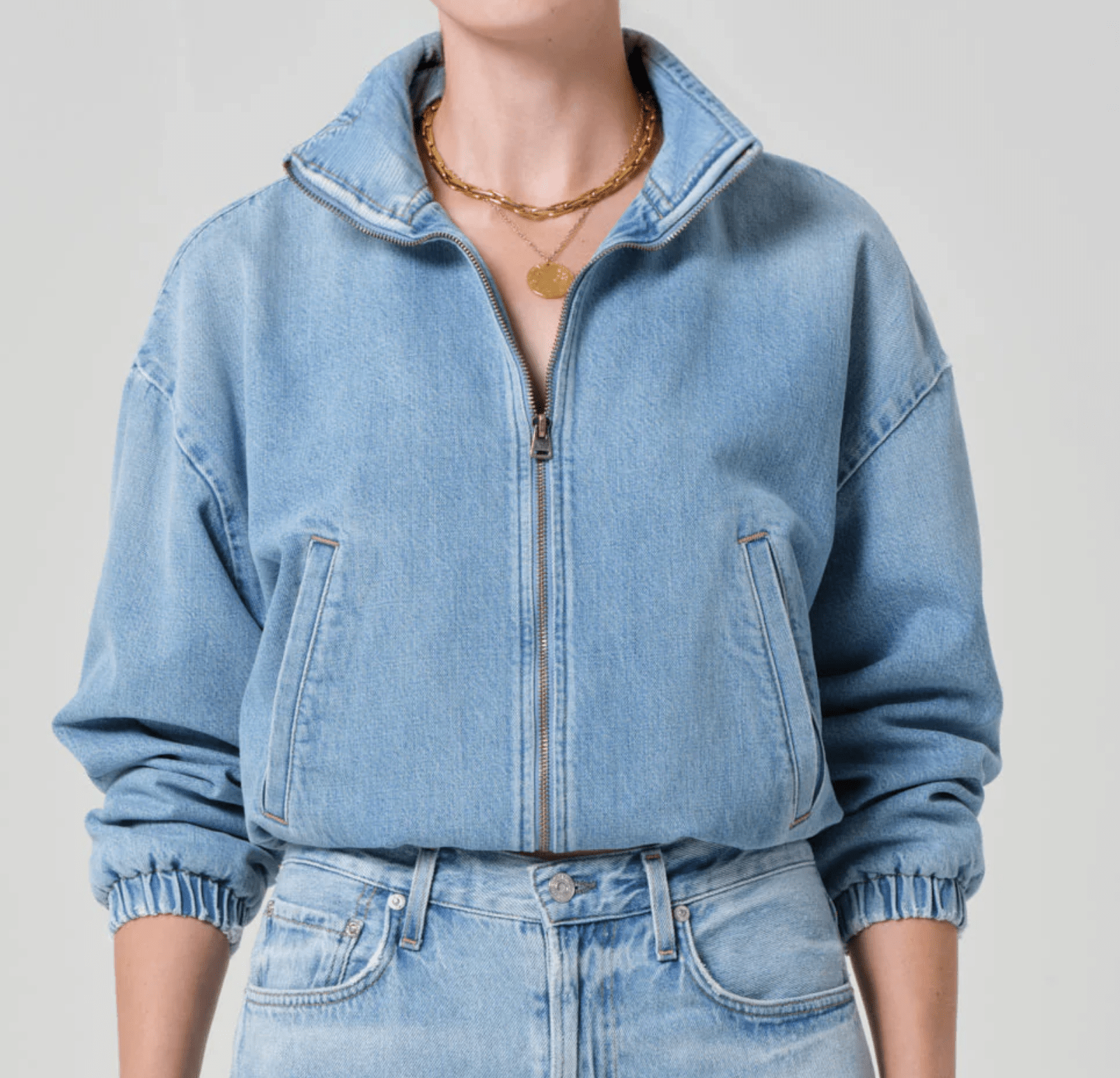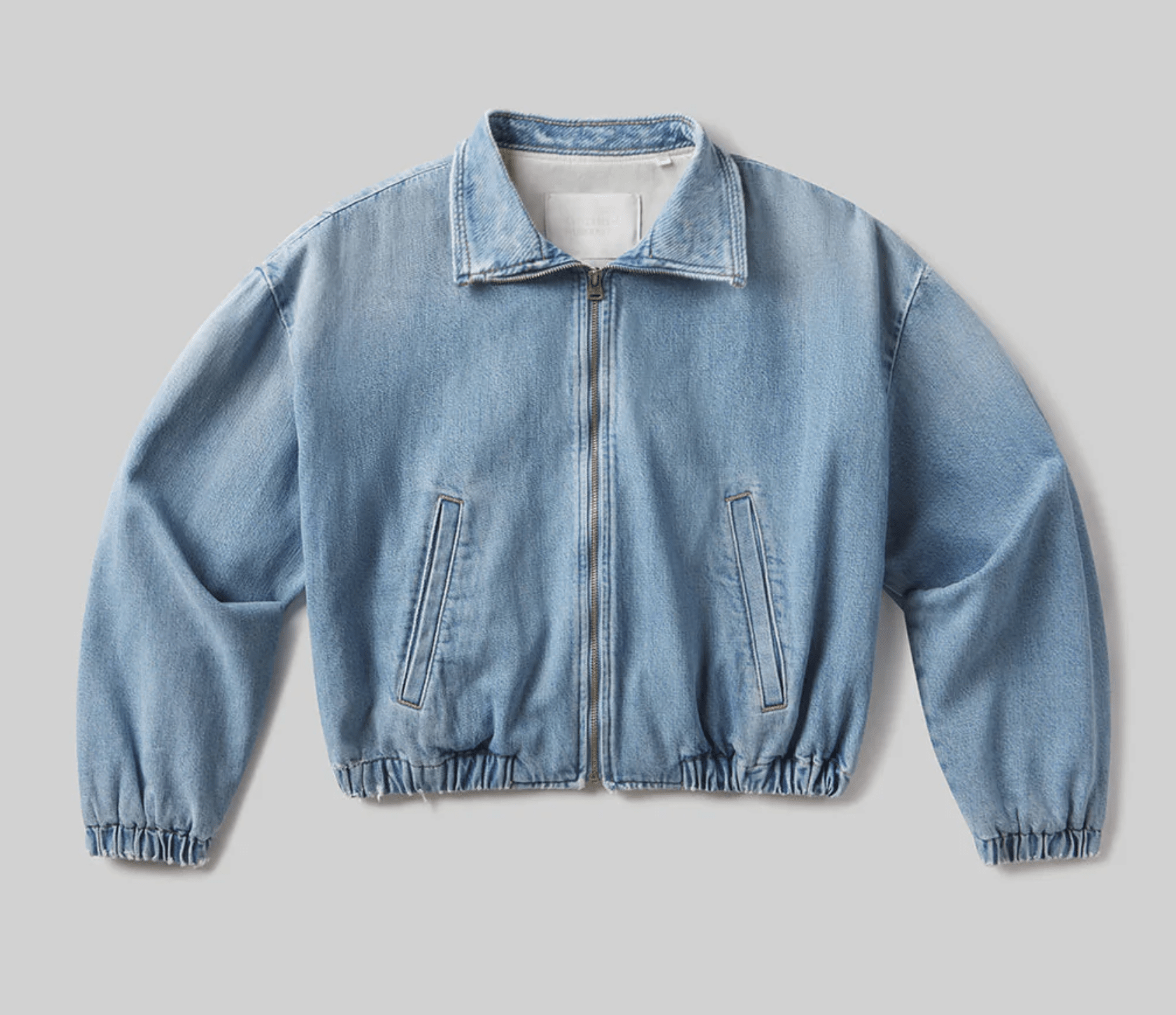 Looks Like: Light vintage indigo denim bomber jacket with elastic at the hem and high collar