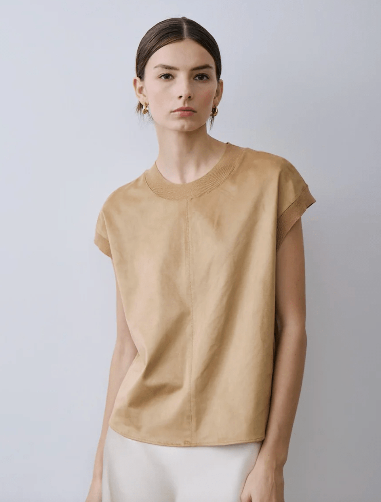 This top is understated luxury at its best. The soft suede texture feels rich and elevated, while the clean, minimalist silhouette keeps it effortless and modern. It’s the kind of piece that instantly makes your outfit feel refined without feeling overdone.