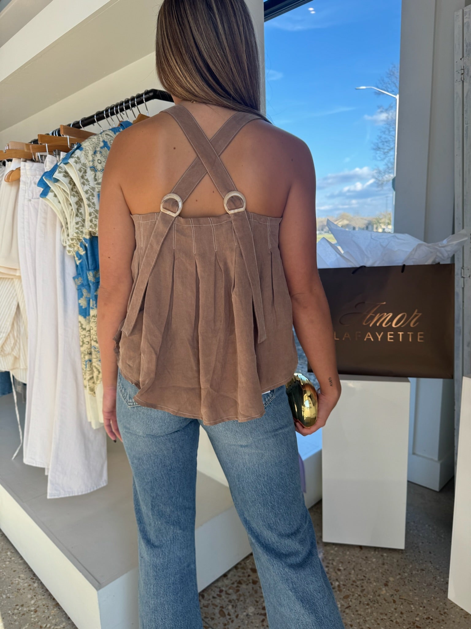 This top is all about texture and detail. From the soft, washed fabric to the layered silhouette and unexpected crisscross back, it feels elevated yet effortless. It’s the kind of piece that looks styled the moment you put it on, no extra effort required.