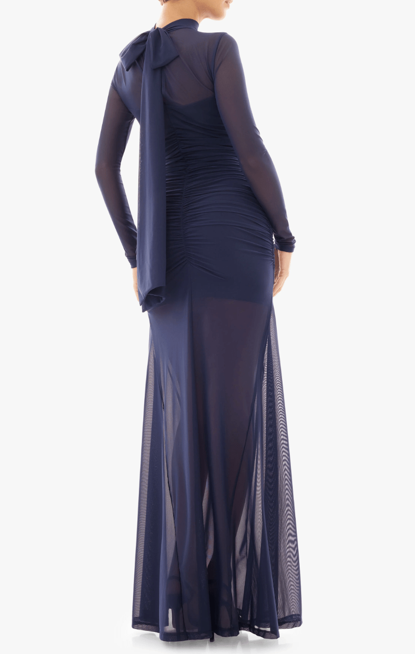 The Elvira Gown turns heads with its striking contrast between structure and sheer movement. Designed with a mock neckline and full-length sleeves in mesh, the fitted body is framed by ruched side seams that flatter from every angle. The silhouette hugs the torso before flaring into a fluid, semi-sheer skirt that creates dramatic flow. A long sash tie at the back neckline adds a final unexpected detail.