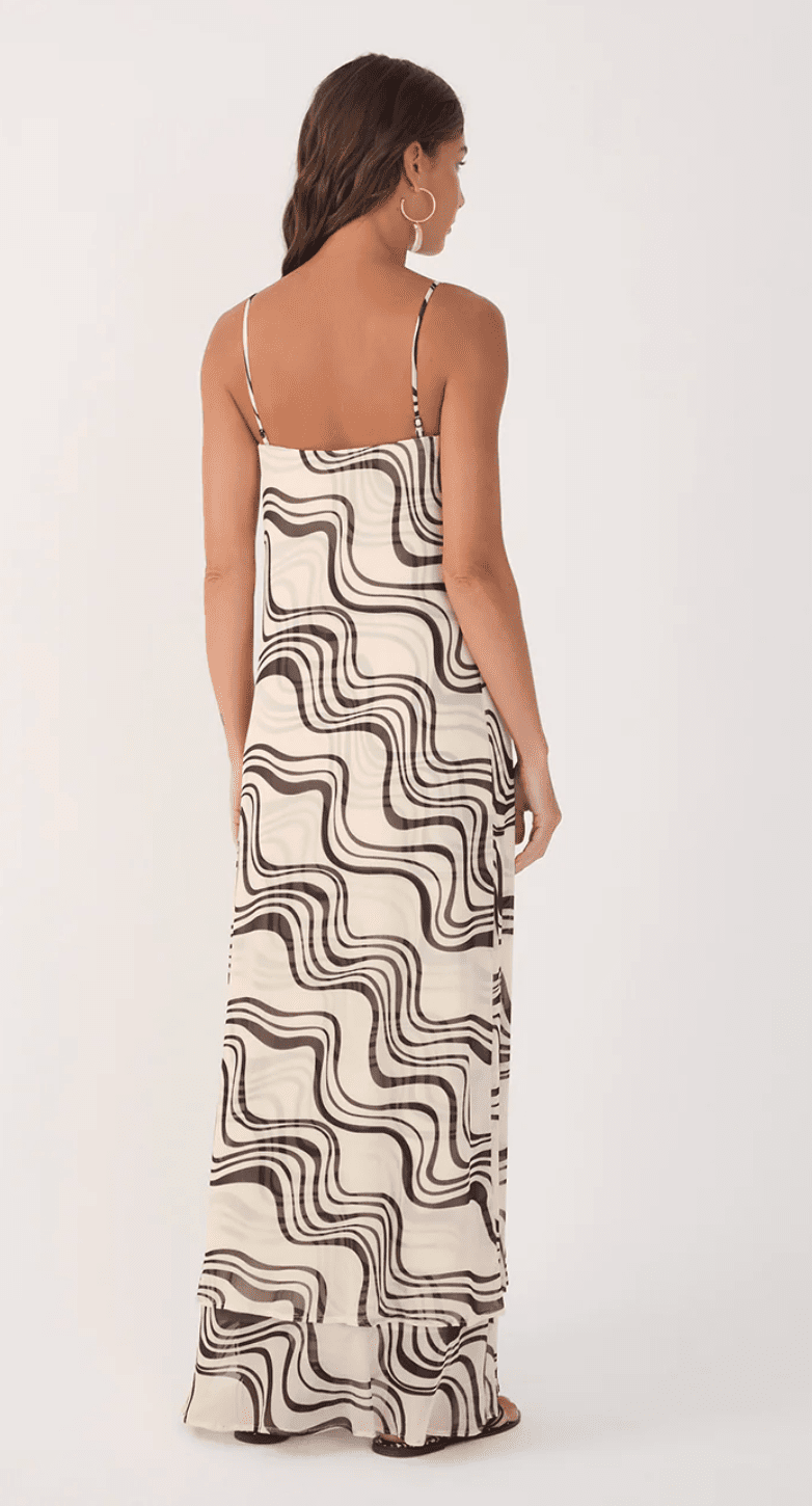 This Tulle Fluir print dress features the lightness of tulle in a graphic wave print. The long design, thin straps, and loose, flowing fit give it an elegant and timeless movement that we love. Perfect for events, parties, or celebrations. Beautiful and indispensable for the season!
