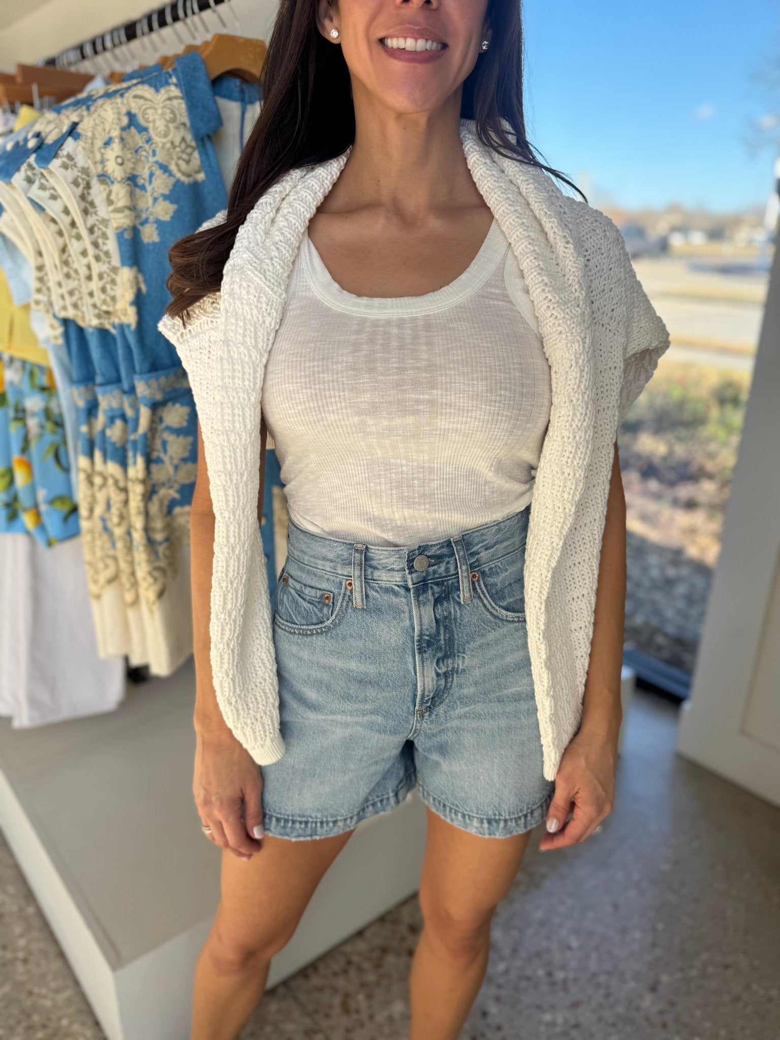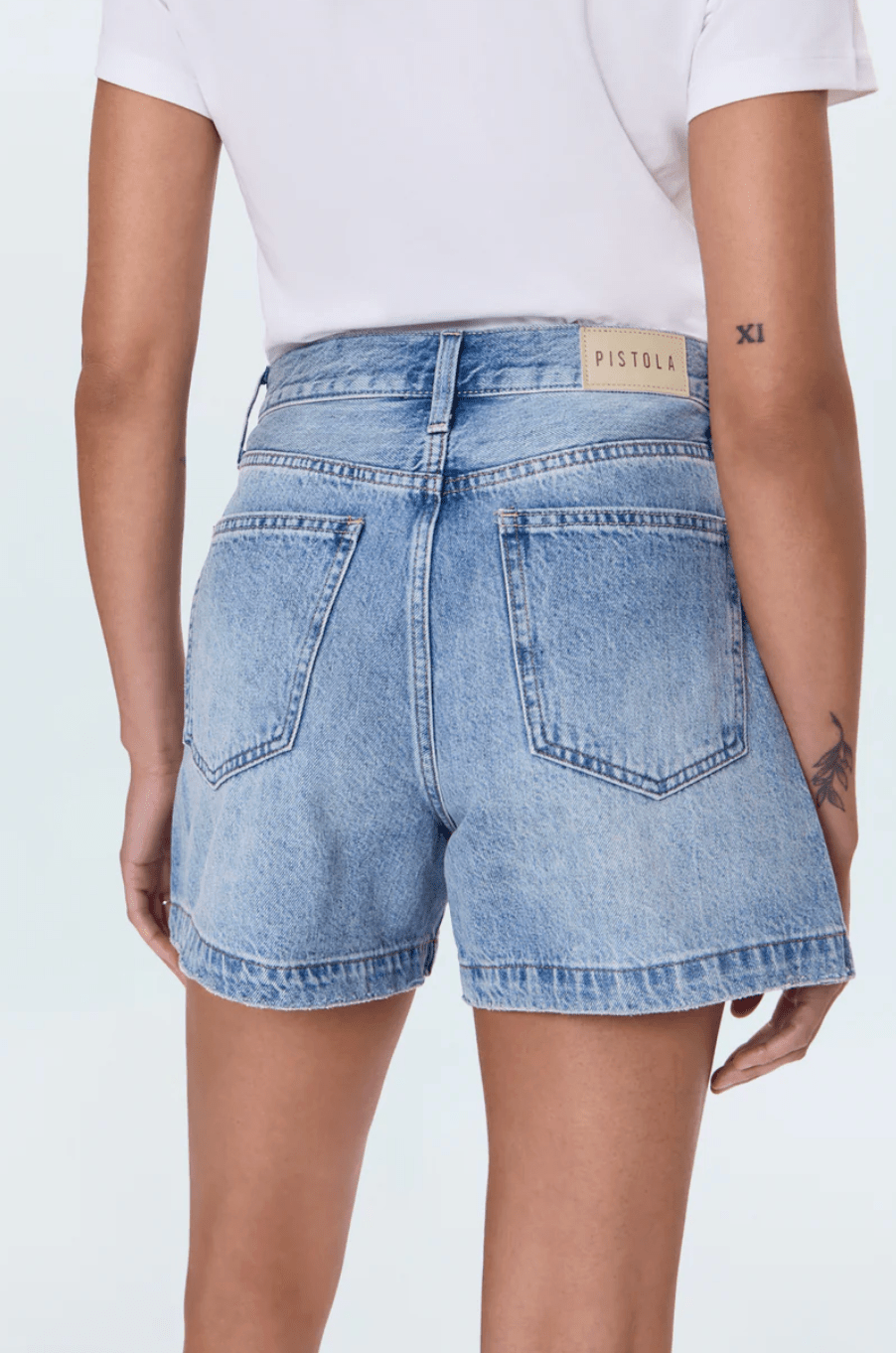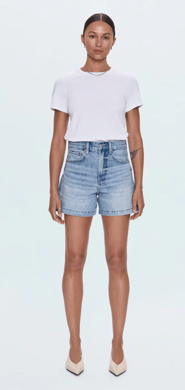 Your summer essential with serious style credentials. Saige sits at an ultra-flattering high rise and features the perfect A-line silhouette. The medium length hits at just the right spot, finished with a 4" inseam for easy, everyday wear. Crafted from rigid non-stretch denim in French Riviera, a medium blue wash with natural fading, whiskering, and a gently frayed hem.
