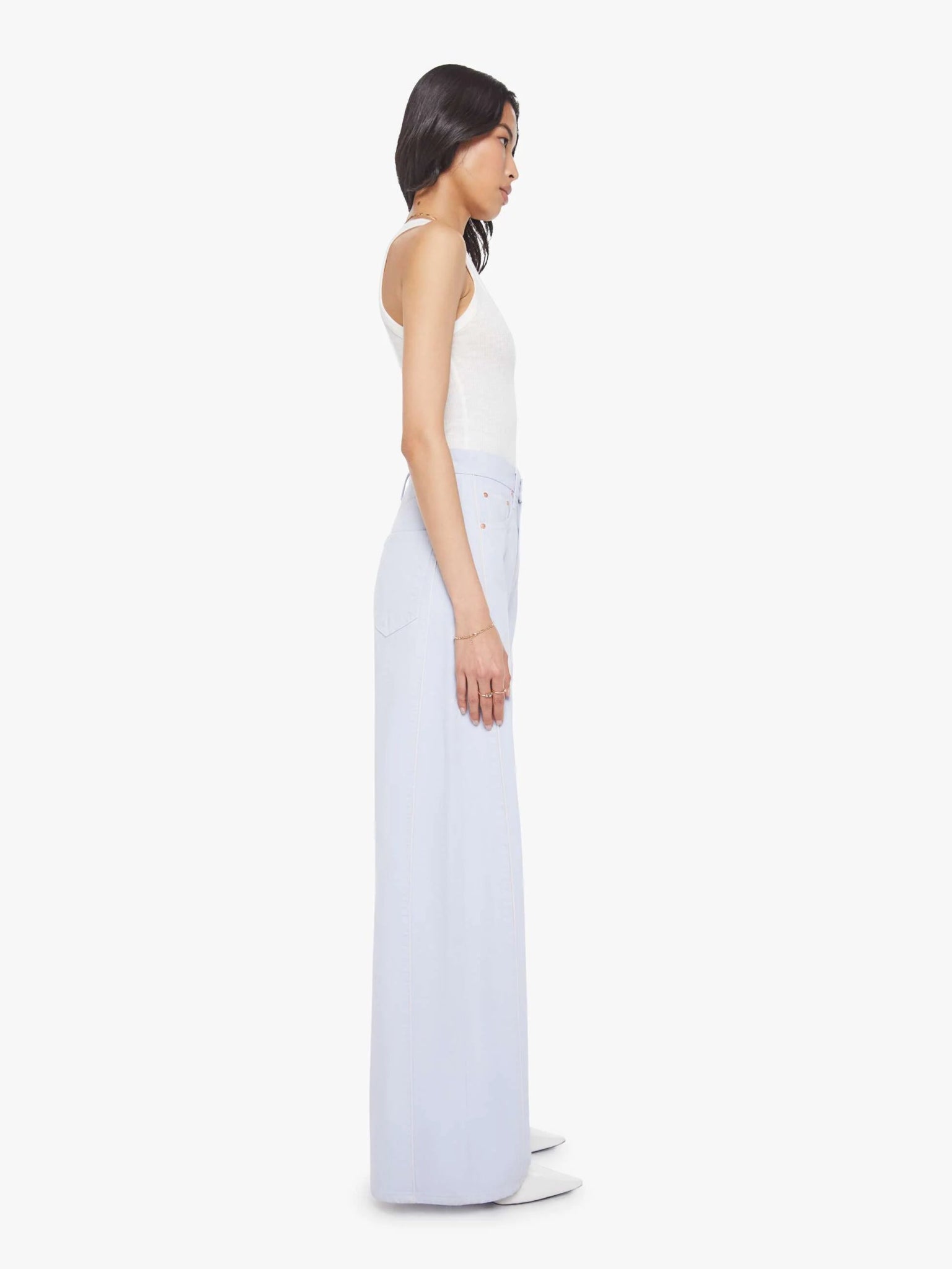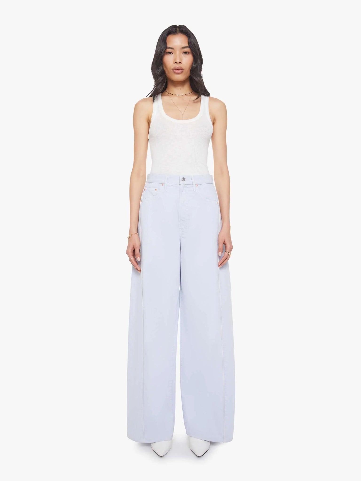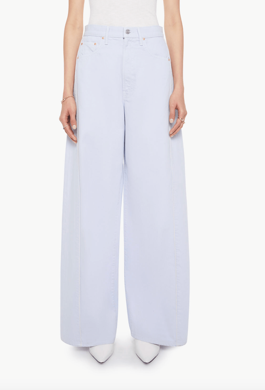 Super high-waisted barrel-leg jeans with a long 32-inch inseam, zip fly, clean hem and relaxed fit. Made from rigid SUPERIOR denim, Hit The Hay is a stone washed light blue with white piping down the outer seams.