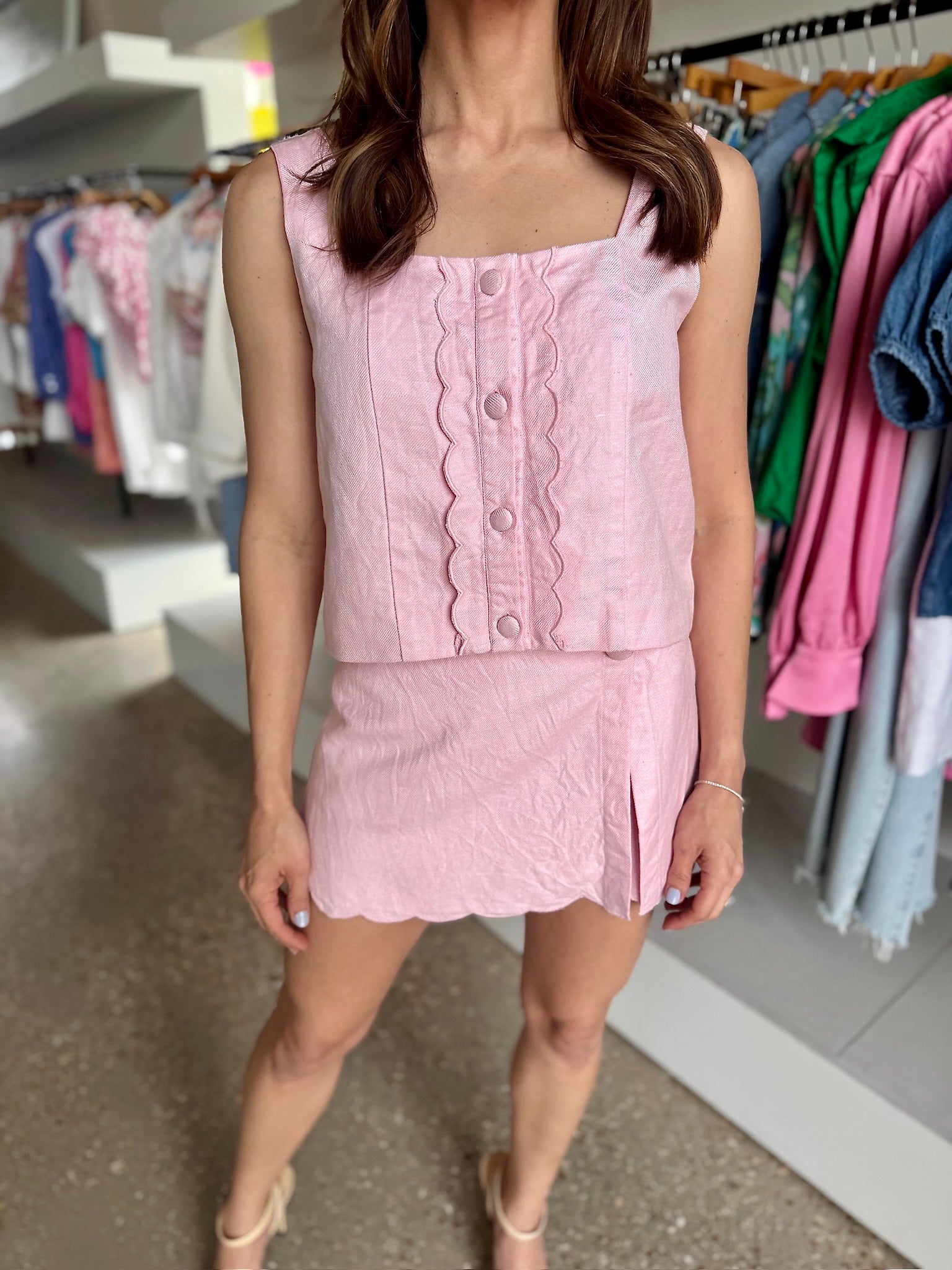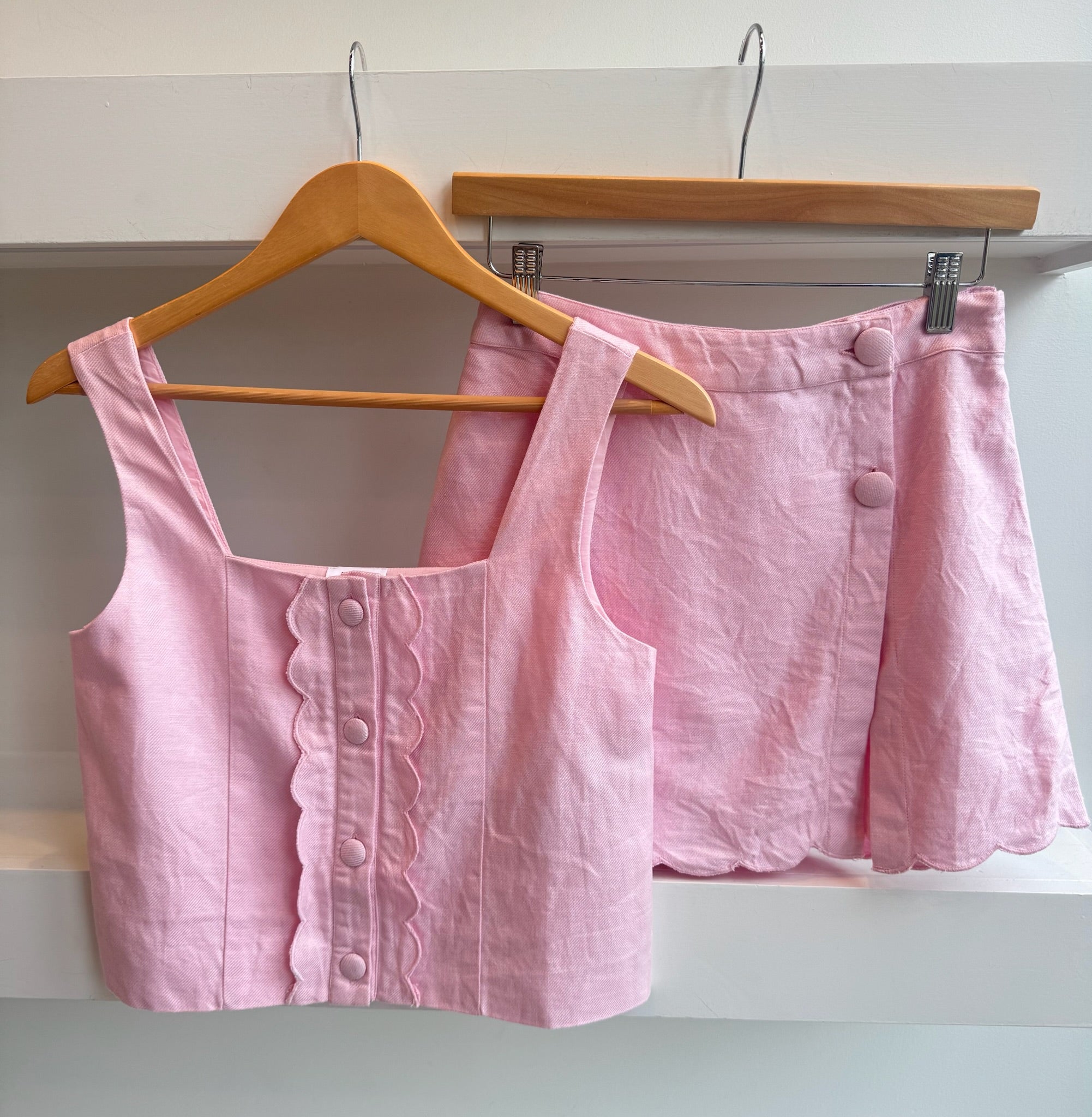 This pink linen top adds a playful twist with scalloped detailing and soft structure.