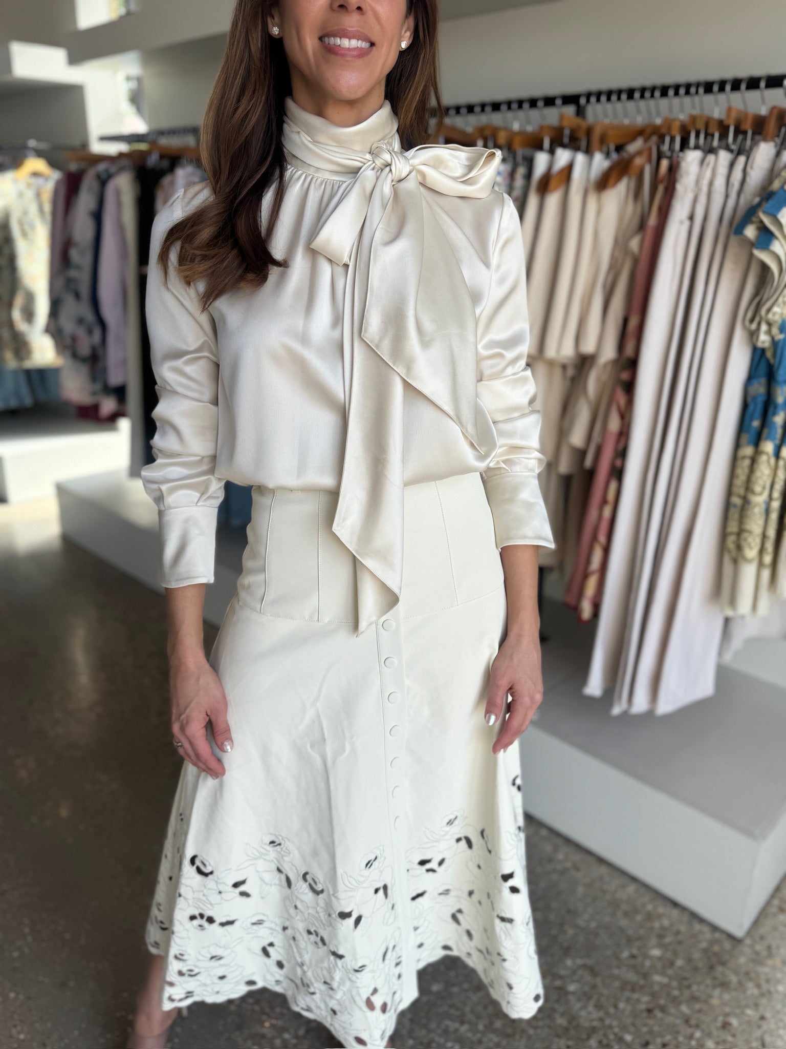 This skirt feels effortlessly feminine with a modern edge. The button-front detail keeps it classic, while the delicate cutout hem adds just the right amount of interest. It’s light, polished, and endlessly wearable, the kind of piece that makes outfits feel thoughtful without feeling fussy.