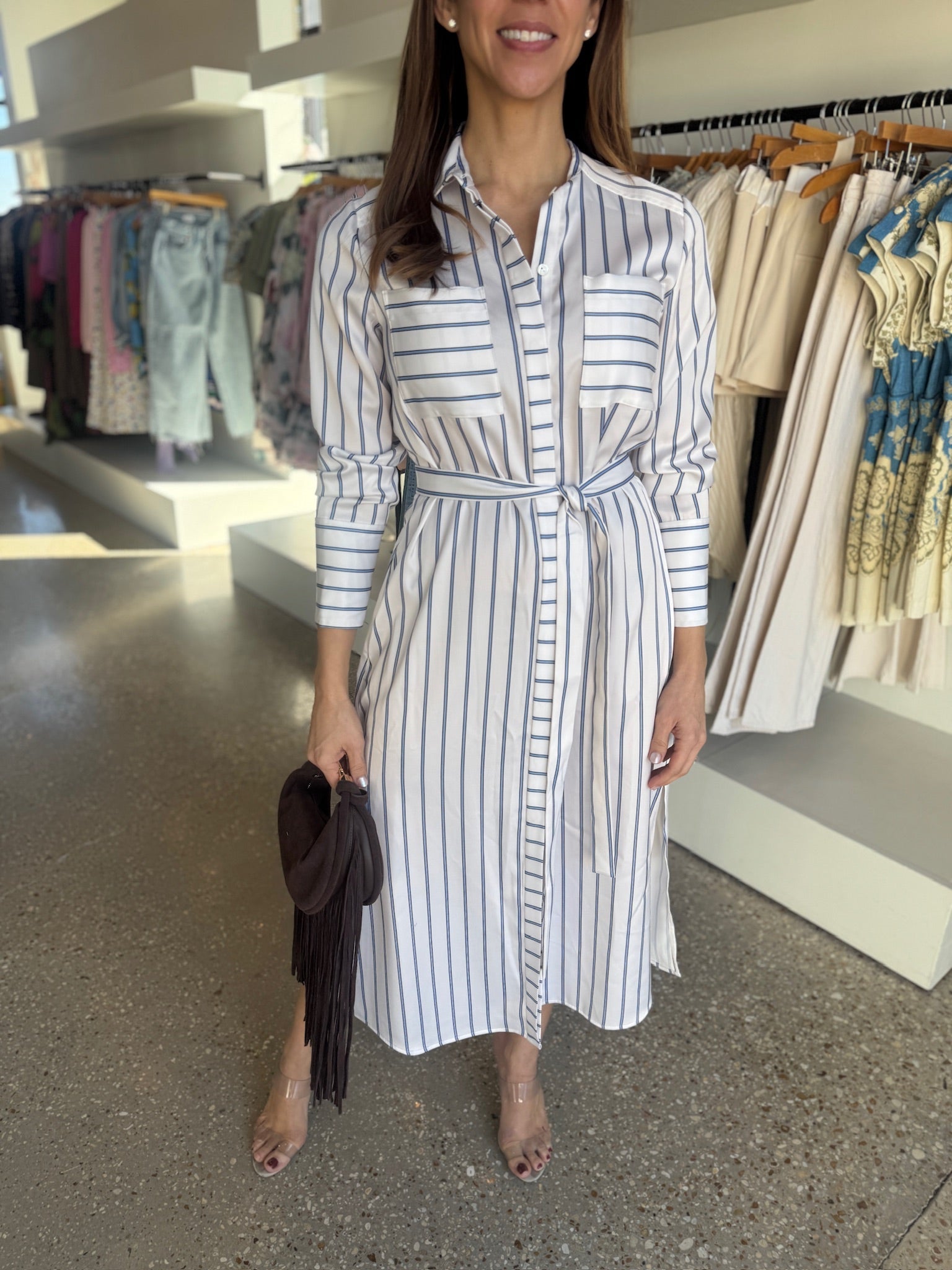 This is effortless polish at its best. The classic stripe gives it that timeless, borrowed-from-the-boys feel, while the cinched waist and fluid shape keep it feminine and flattering. It’s the kind of dress that looks pulled together without ever feeling fussy.
