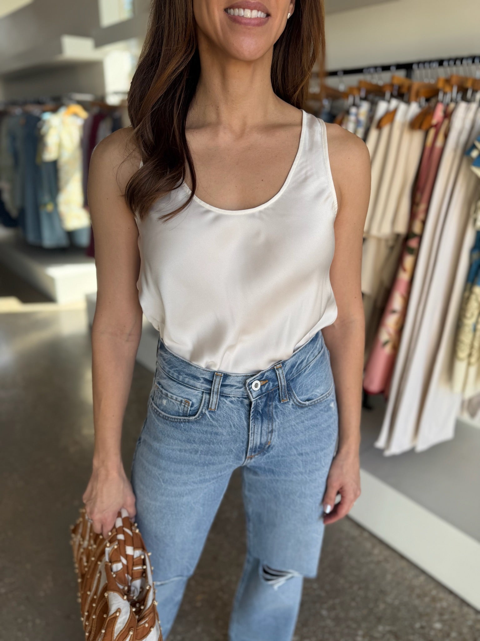 Sometimes the simplest pieces do the most work. The Ivory Clean Cut Tank is smooth, sleek, and endlessly versatile. With its clean lines and polished finish, it’s the kind of foundational piece that makes everything else in your closet look better.
