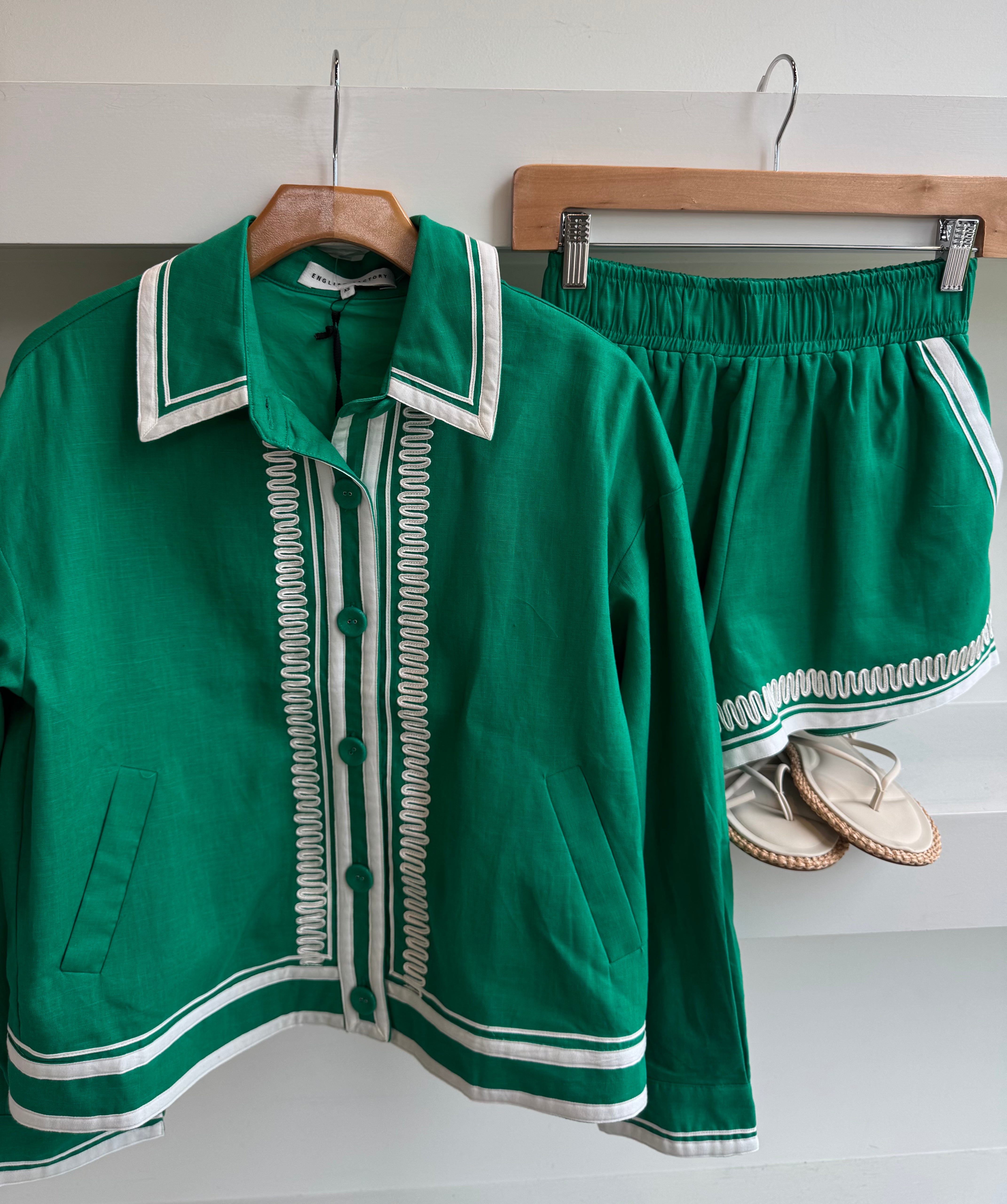 Make a statement in The Giselle Embroidered Jacket - a bold blend of classic tailoring and playful charm. Designed with eye-catching contrast trim and intricate embroidered detailing, this standout piece channels elevated resort energy with a hint of retro flair. The structured collar and button-down silhouette add polish, while the vibrant green hue keeps it fresh and fashion-forward. Whether styled with the matching shorts or layered over a sleek dress, Giselle brings confidence, color, and character to every look. Your closet just found its new it-piece.