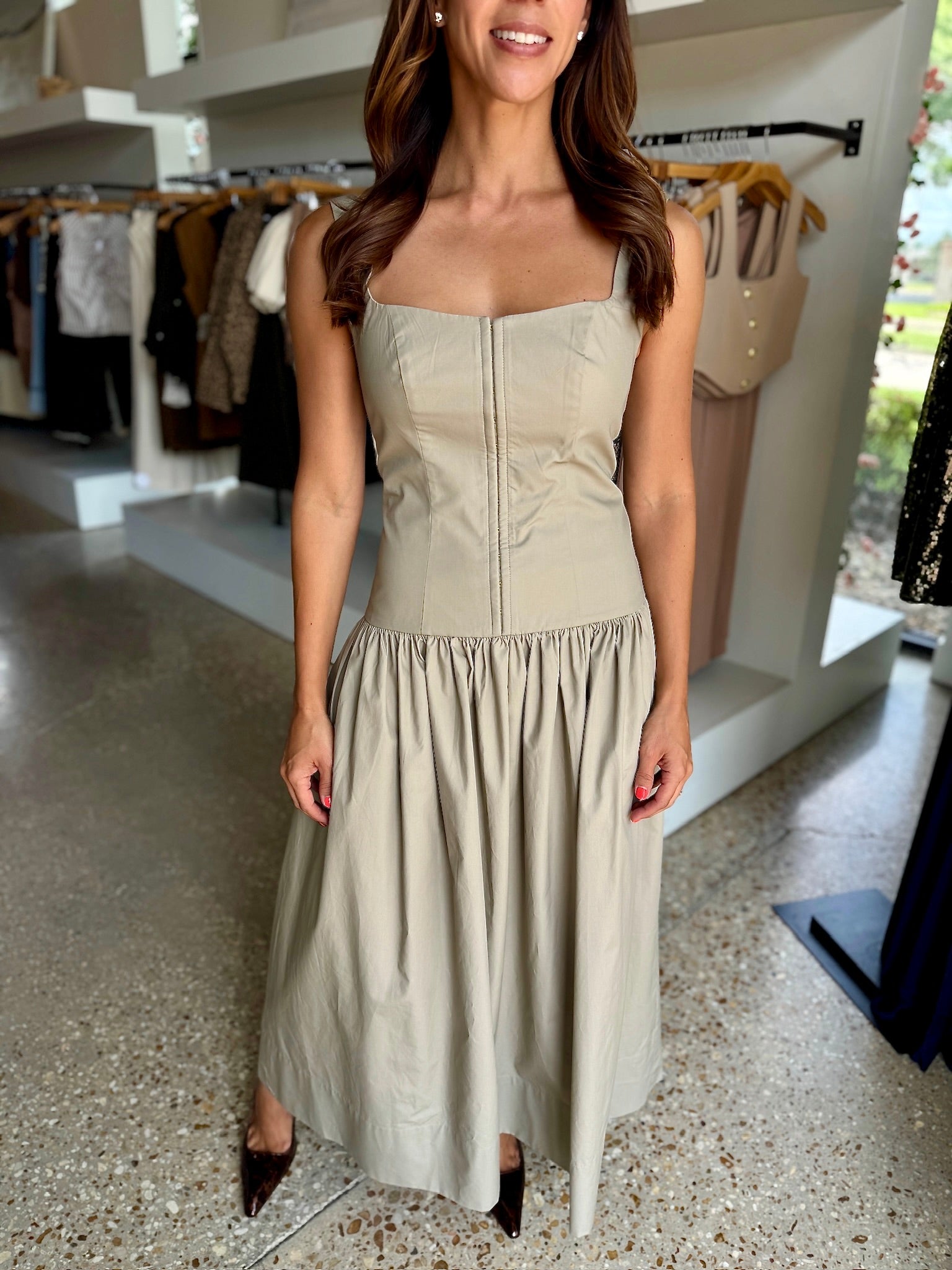 Square neck midi dress in laurel oak in an organic cotton poplin.