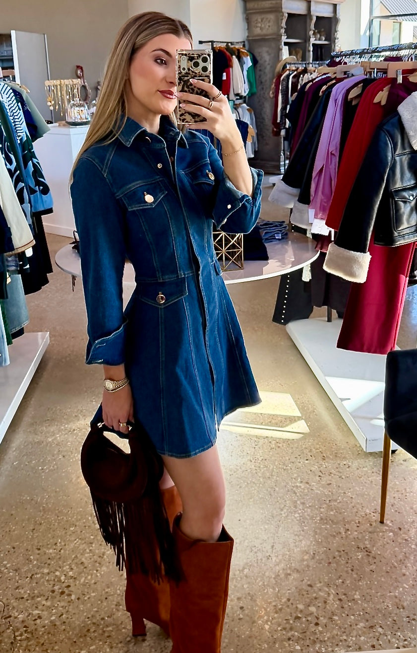This is denim, but make it polished. The Navy Daniela Mini feels structured yet effortless, with clean lines and subtle tailoring that elevate it beyond your everyday denim dress. It’s the kind of piece that works hard in your closet, timeless, flattering, and endlessly wearable for the Amor girl.