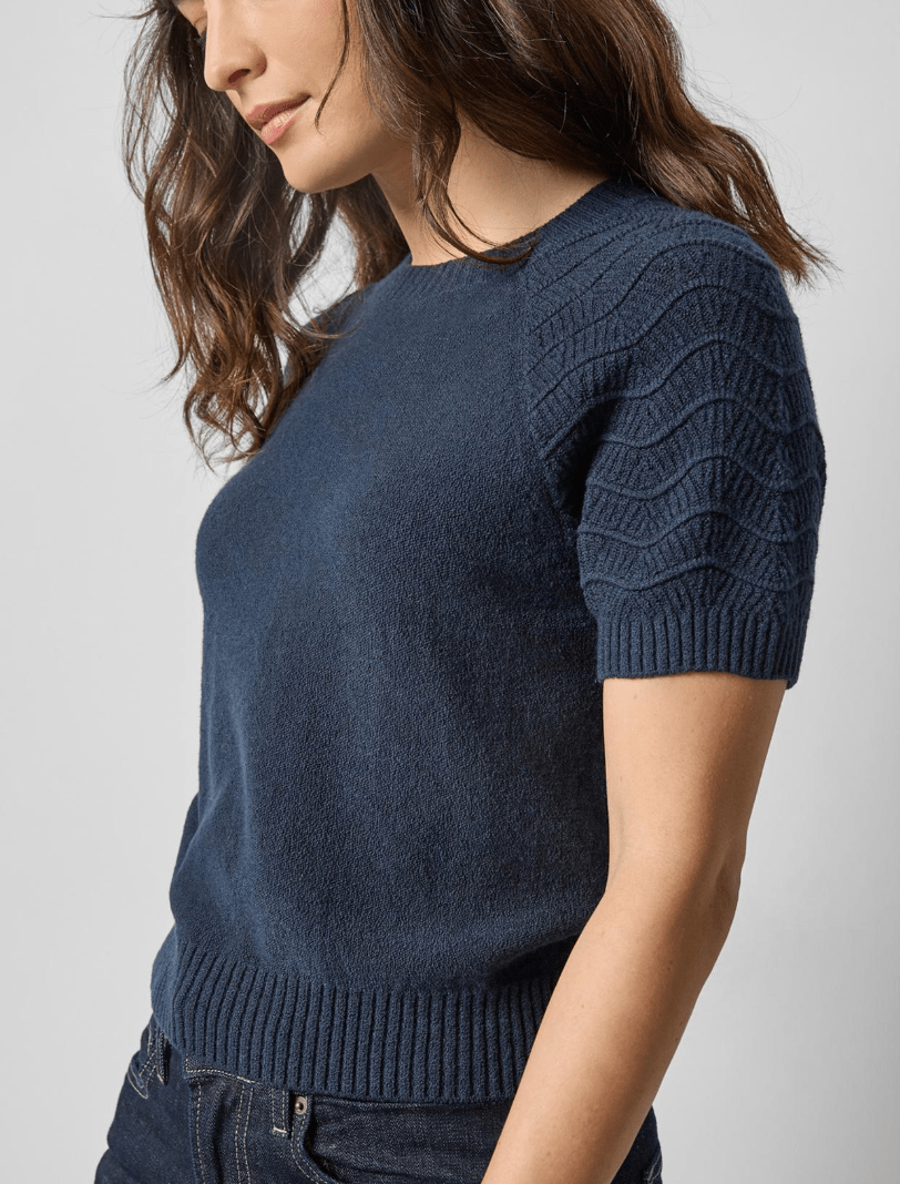 The Textured Sleeve Sweater is knit in an eco-friendly cotton boucle with a touch of stretch. The lightweight jersey stitch keeps it easy and comfortable, while the boucle yarn adds subtle texture throughout. Raglan sleeves and a short sleeve silhouette make it perfect for layering or wearing on its own. A unique stitch detail on the sleeves adds just enough interest to this simple shape.
