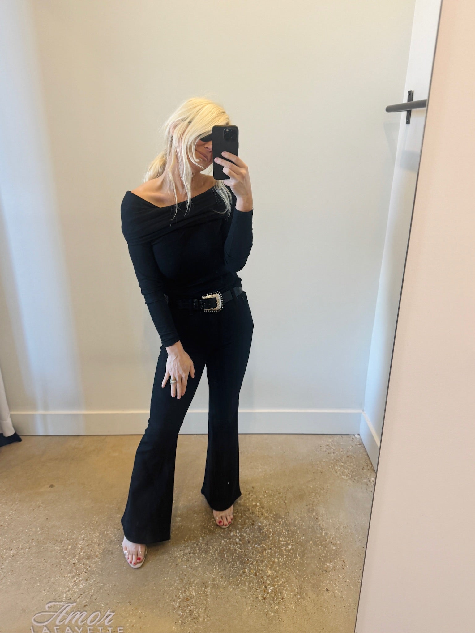 The knit that doubles as a statement, Lyra features an off-shoulder neckline, long sleeves, and a close fit through the body. Crafted from a soft, stretchy modal blend in Noir, a rich black that goes with everything.
