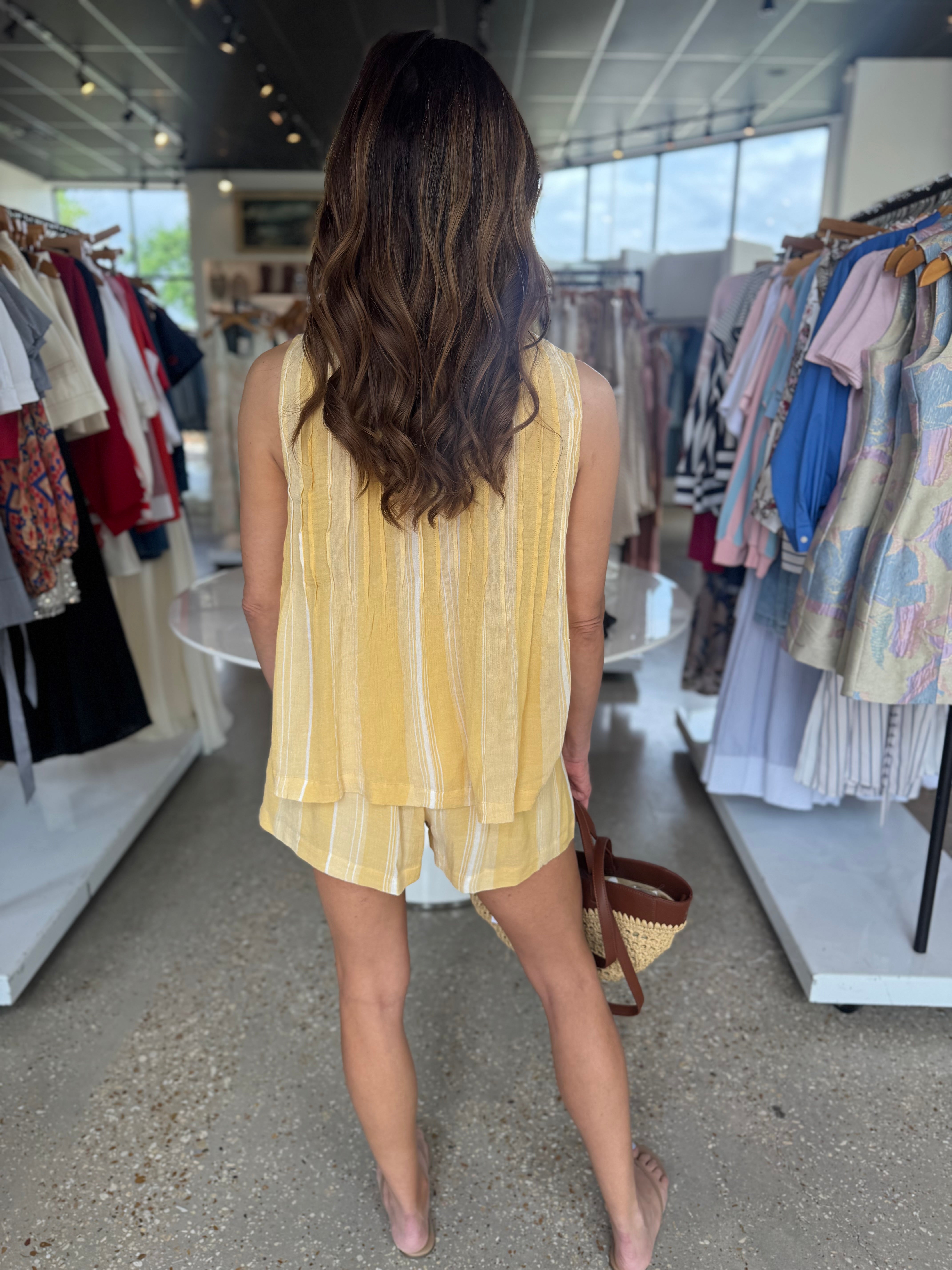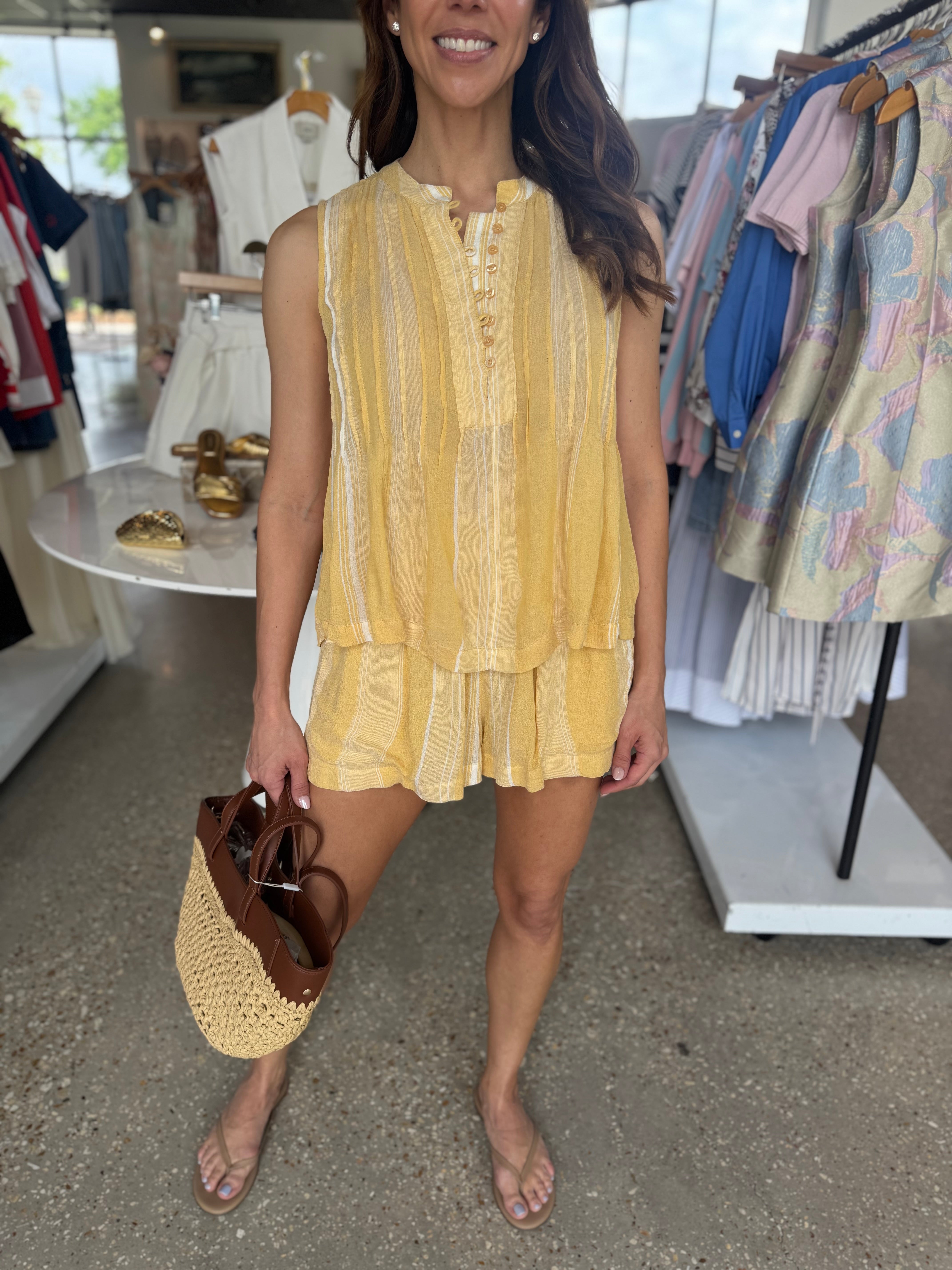 Light, airy, and effortlessly feminine, the Sunshine Lydie Top is made for warm, sun-filled days. Featuring delicate pintuck detailing and a sleeveless silhouette, this top offers a breezy, flattering fit with a touch of texture and charm.