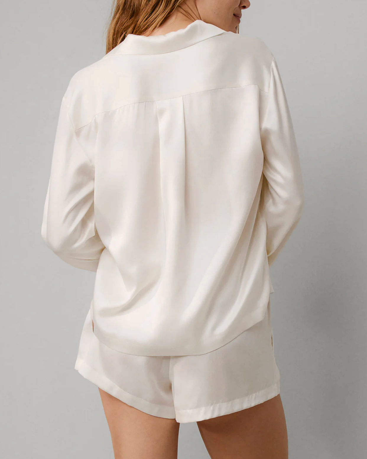 White Silk Button up Short SeEnjoy the blissful comfort of our Washable Silk Button Up Long Sleeve Short Set by Lunya. This lounge set is designed to provide you with the ultimate dreamstate experience. The silk fabric, both luxurious and practical, can be easily washed and worn, making it perfect for those restful moments in your day. Revel in the ease and elegance of this set, and you might just find yourself saying, 'let's go back to bed.'